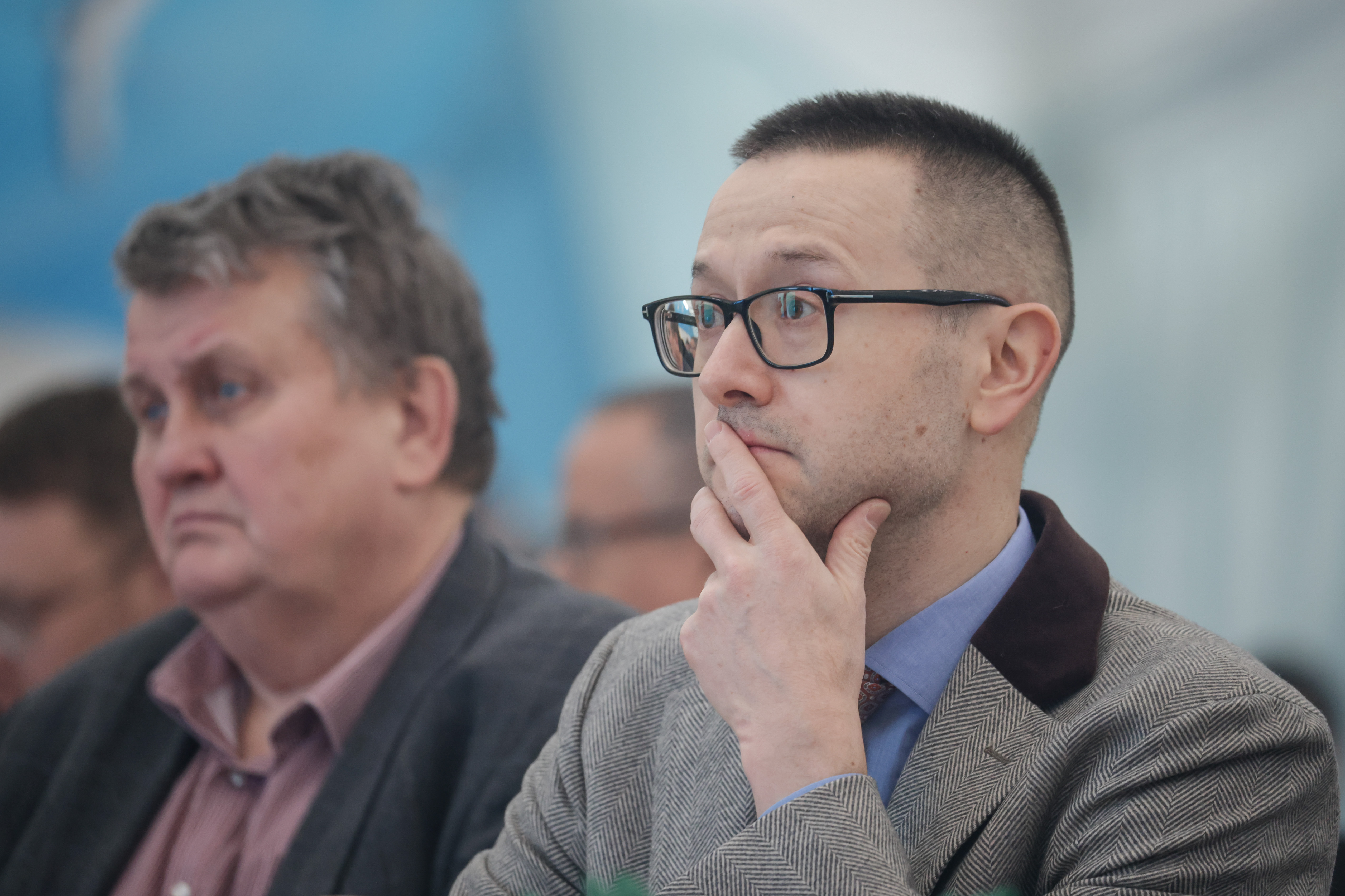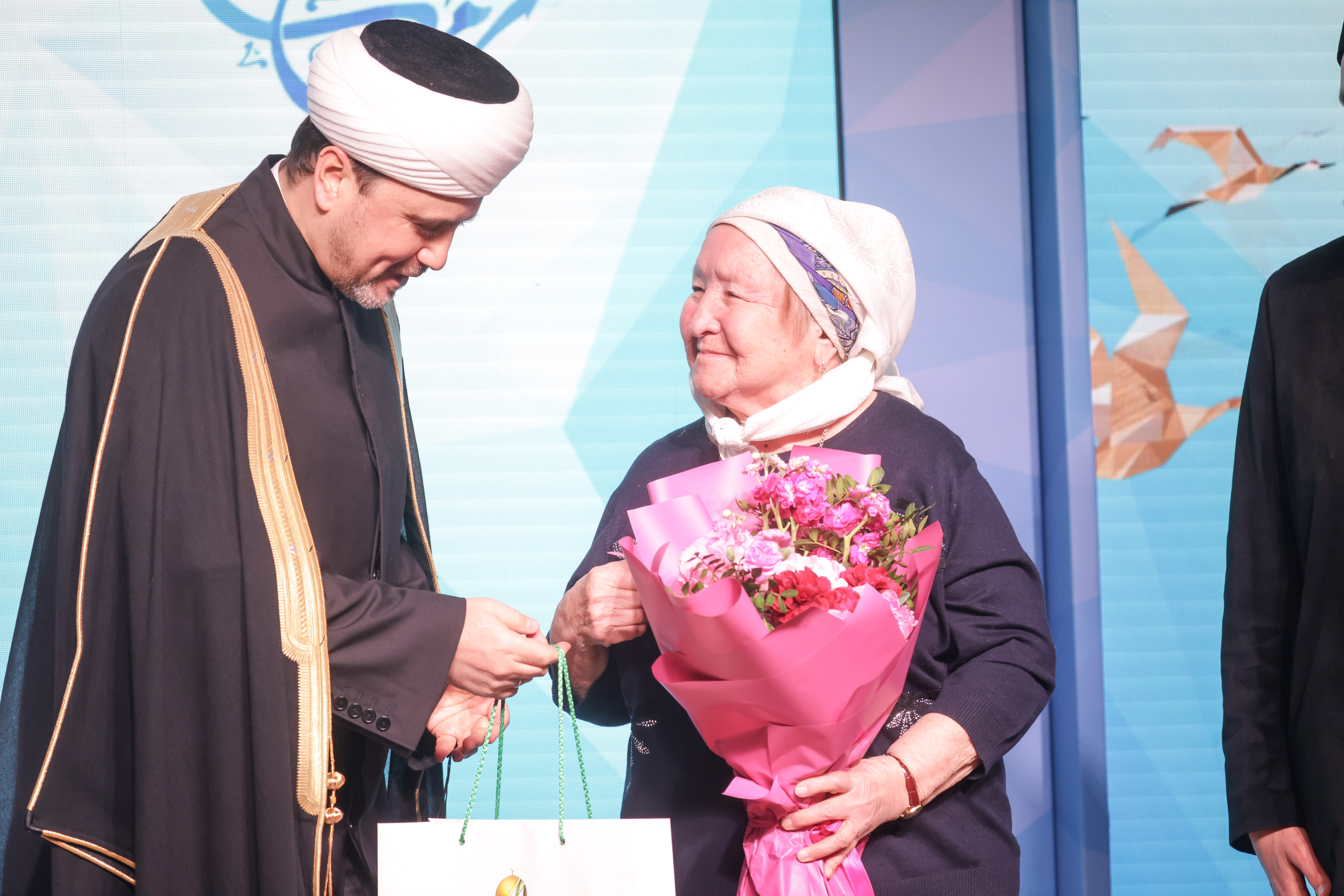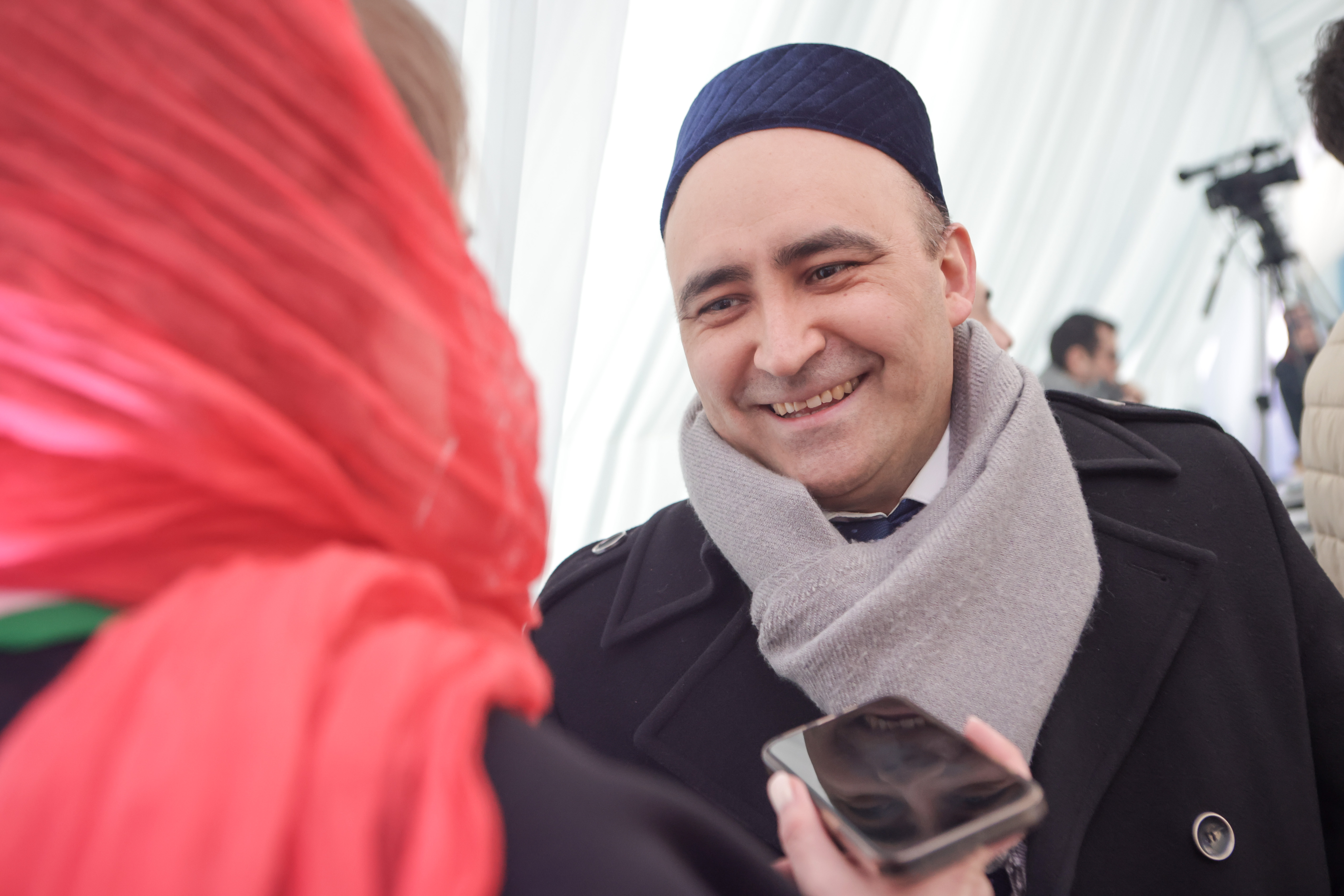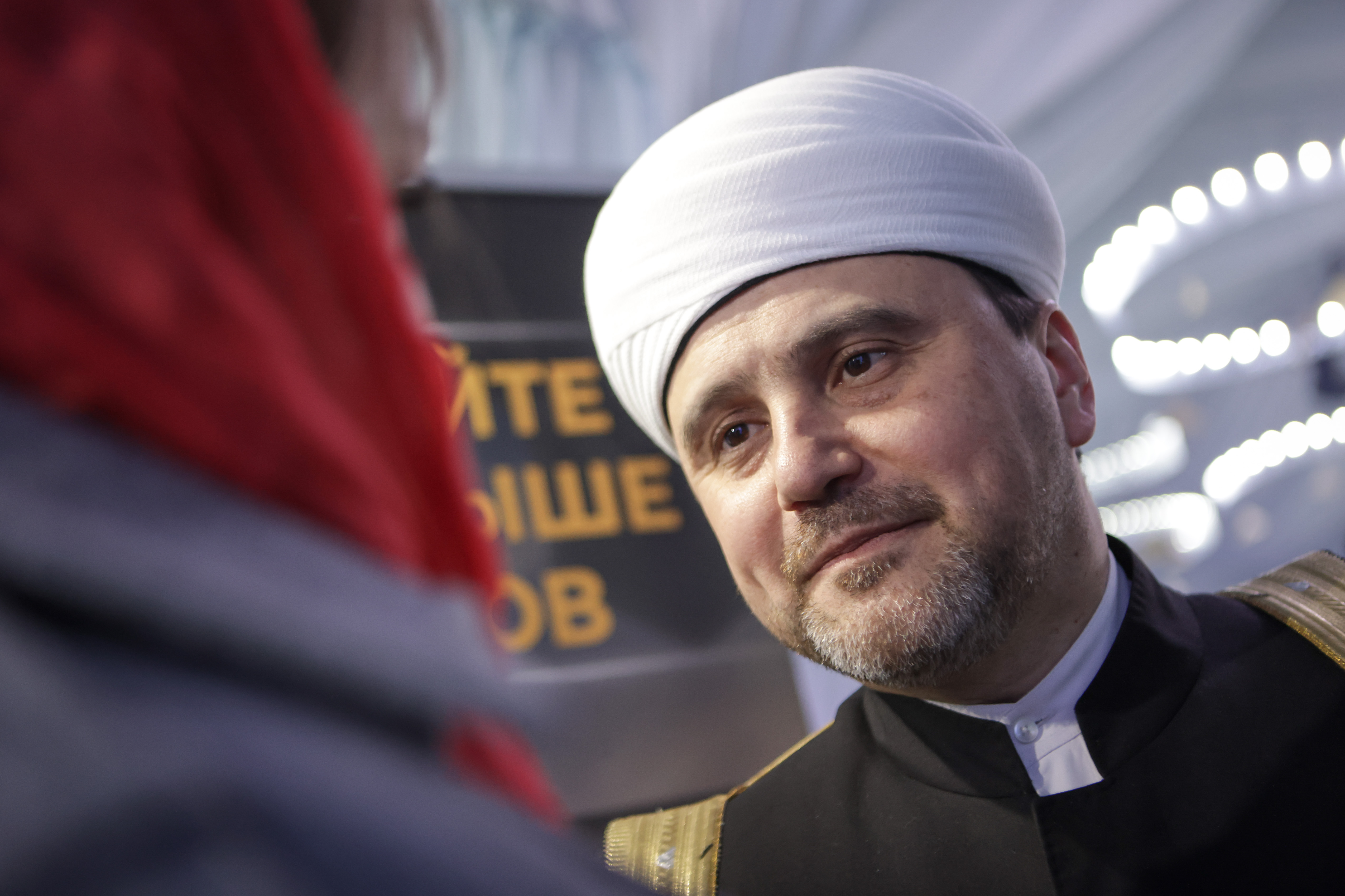 Муфтий Москвы Ильдар Аляутдинов в этот день приветствовал всех с экрана из Медины. Зато в зале был его старший брат — популярный проповедник Шамиль Аляутдинов, одетый в элегантный серый пиджак.