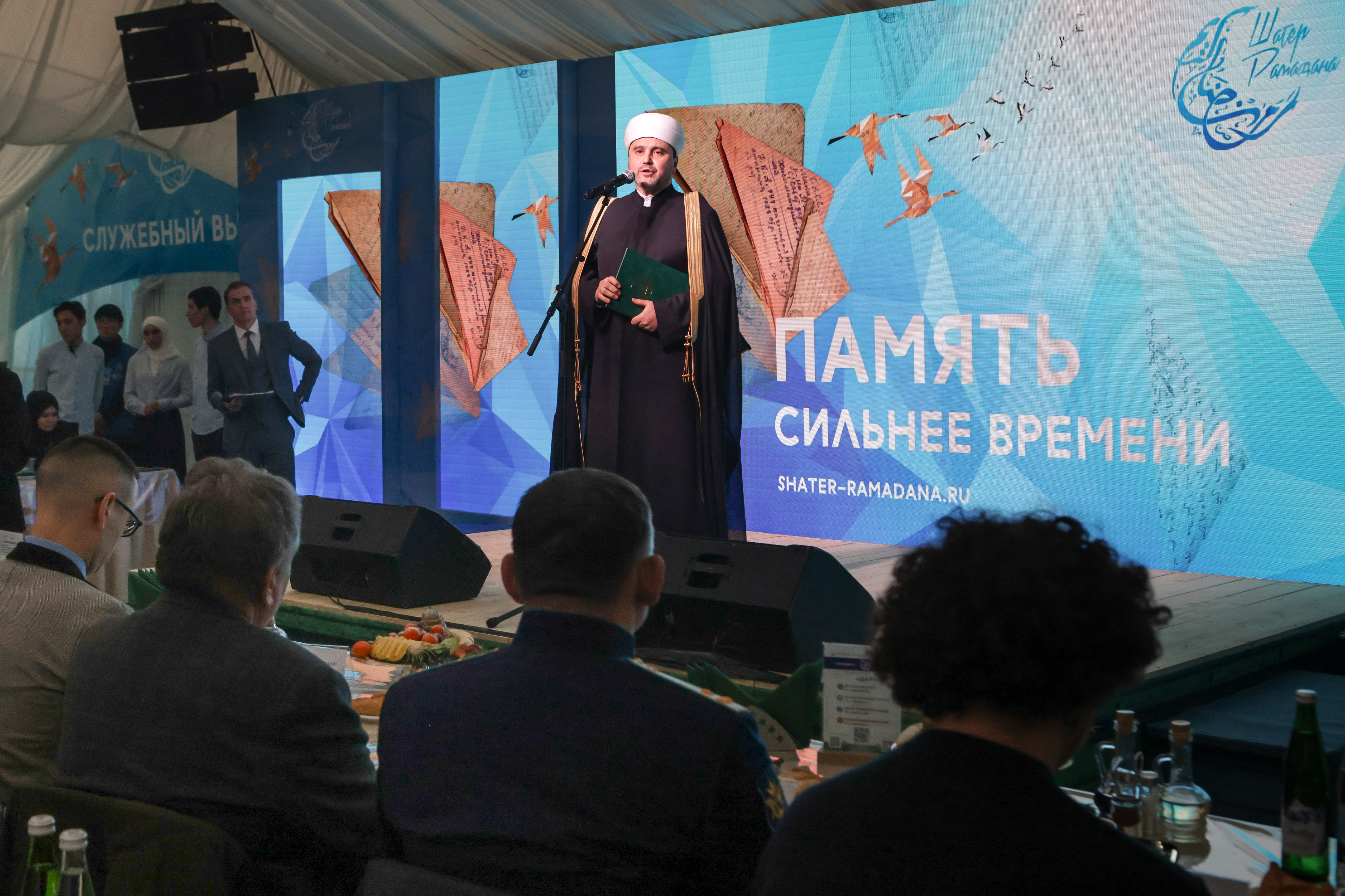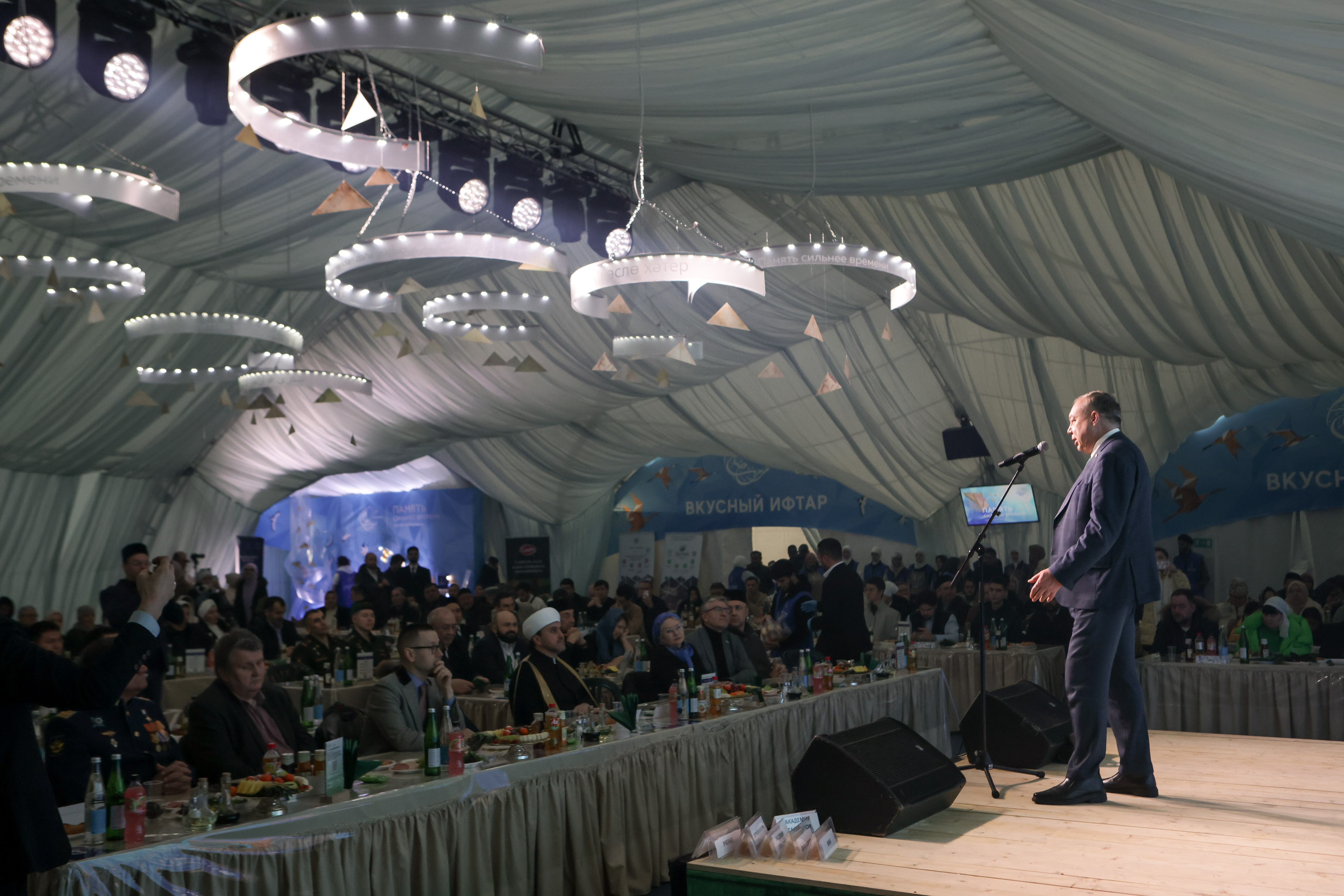 Начальник департамента по взаимодействию с религиозными организациями управделами президента РФ Евгений Ереминговорил о том, что «Шатер Рамадана» проводится на месте, посвященномдоблести защитников Отечества. «Наша Великая Победа — свидетельство единства нашего многонационального и многорелигиозного народа, результат тысячелетнего единения людей разной веры, разной национальности в рамках единого общего государства. И это единство проявляется сейчас на полях СВО. Наши воины, представители разных национальностей, молящиеся по-разному Богу или немолящиеся, защищают вместе наше государство. А ведут их в бой, вдохновляют наши военные священники, военные имамы, которые несут слово Божье нашим воинам», — сказал он. Еремин пожелал, чтобы Всевышний даровал «сил и энергии избежать страстей и искушения» во время Рамадана, а также дал возможность осмыслить свое существование, сделать много добрых дел. «Чтобы Господь дал нам победу, дал мир на нашей земле, мир в Европе, в России и, конечно, на святой земле. Рамадан карим, Рамадан мубарак», — под аплодисменты сказал чиновник.