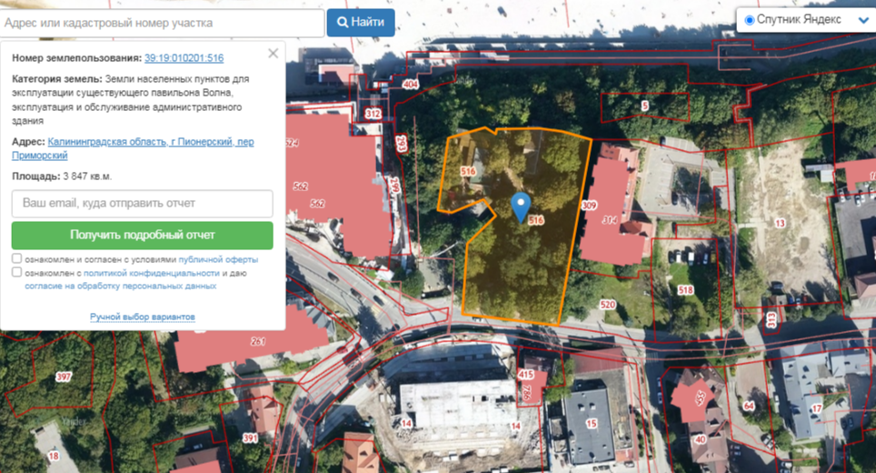 Соседний участок 39:19:010201:518 площадью 1,2 тыс. кв. м имеет назначение под «гостиничное обслуживание». До недавнего времени на нем располагалось историческое здание бывшего дома быта довоенной постройки и небольшой сквер. В сентябре 2021 года здание выкупило ООО «Западный порт Риэлт» под руководством бывшего председателя совета депутатов Пионерского Алексея Преснякова. Ныне компания переоформлена на Бориса Бабаянца, родственника экс-руководителя правительственного Фонда жилищного и социального строительства. RUGRAD подробно рассказывал историю этой территории в тексте «Апарты вместо дома быта» в Пионерском и описывал перспективы ее точечной застройки в соответствии с утвержденным на градсовете проектом.