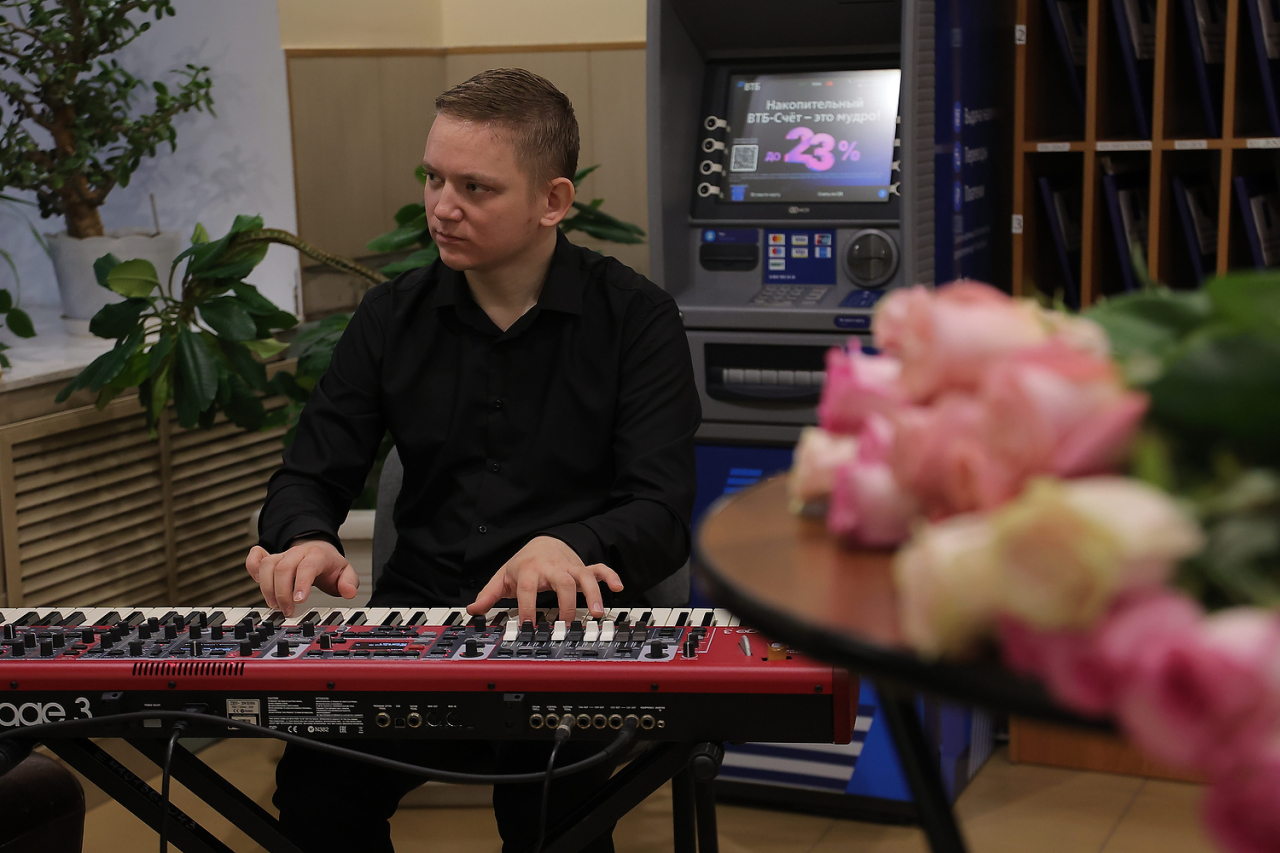 Холл,в котором развернулось торжественное поздравление,заранее украсили тематическими шарами. Также для создания весеннего настроения был приглашен музыкант,который встречал сахалинок живой музыкой.