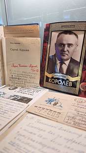 Второй стенд посвящен главному космическому конструктору Сергею Павловичу Королёву, рядом с ним – конечно, первый космонавт, Юрий Гагарин. В этих стендах расположились не только памятные предметы и фото, но и многие уникальные экспонаты – книги, открытки, на которых остались подписи родных и близких тех людей, чей труд позволил вывести ракеты в космос.