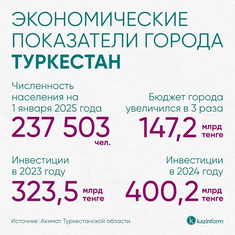 В регионе планируется реализовывать инициативы, изложенные в законе, также будут проводиться туристические мероприятия республиканского и международного уровня. Как сообщает акимат Туркестанской области, с момента присвоения статуса областного центра, общий объем валового регионального продукта увеличился в 4,5 раза, составив в 2024 году 452,6 млрд тенге. А доходы в государственный бюджет города увеличились в 2,8 раза и достигли 66,2 млрд тенге в 2023 году, а в 2024 году эта цифра возросла до 80,1 млрд тенге. Вместе с тем бюджет города увеличился в 3 раза до 147,2 млрд тенге.