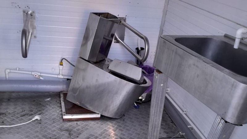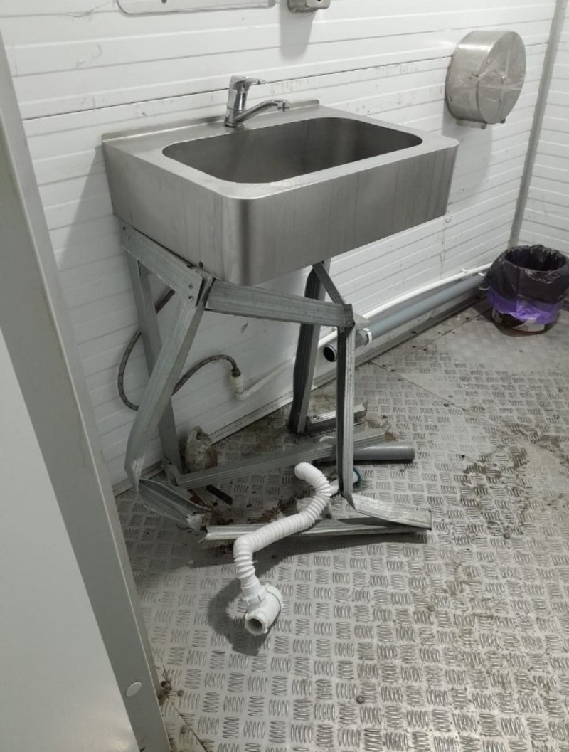 Неизвестные лица вырвали и выбросили на улицу дозатор для бумажных полотенец, оторвали унитаз от пола, повредили розетку и сломали сантехнику.