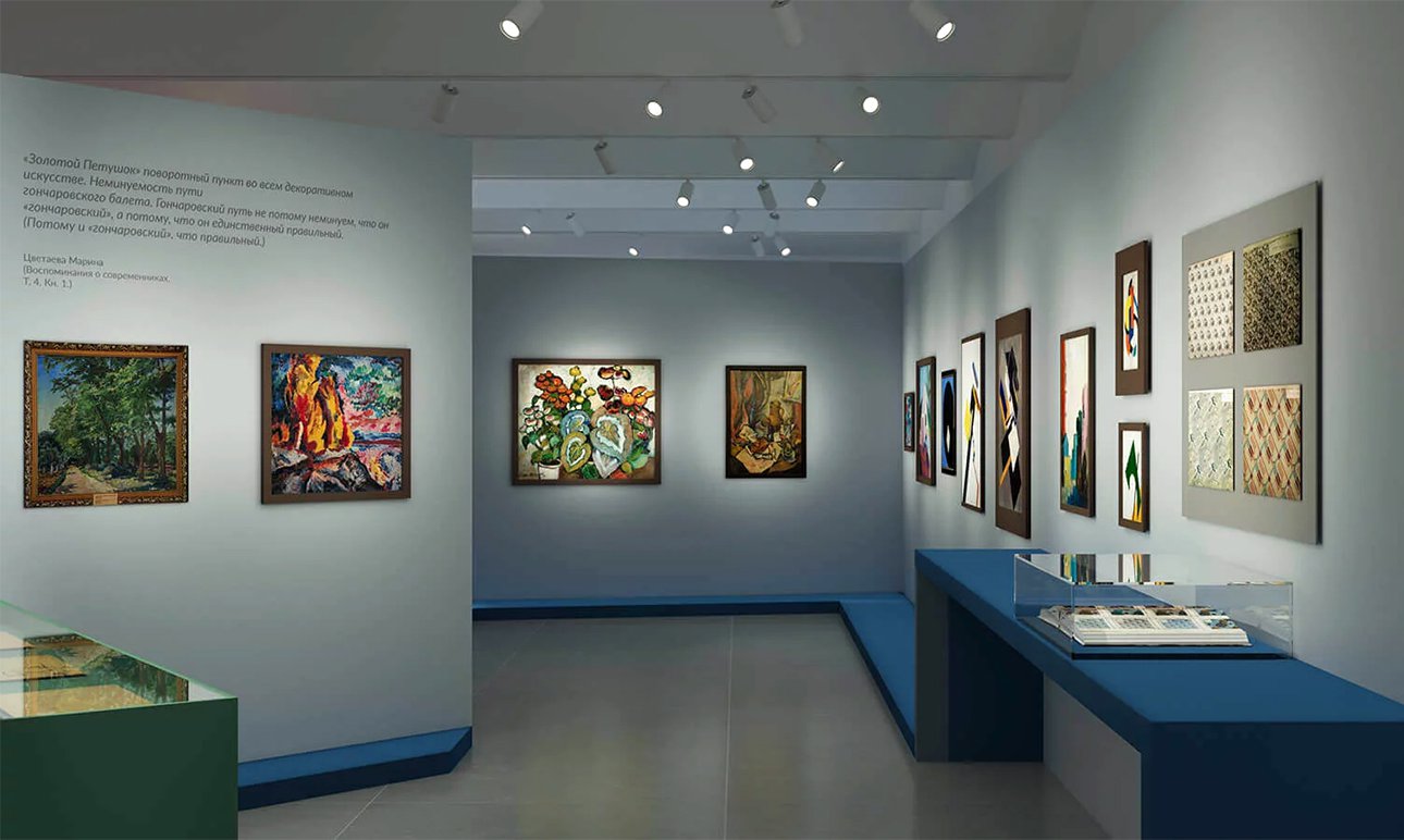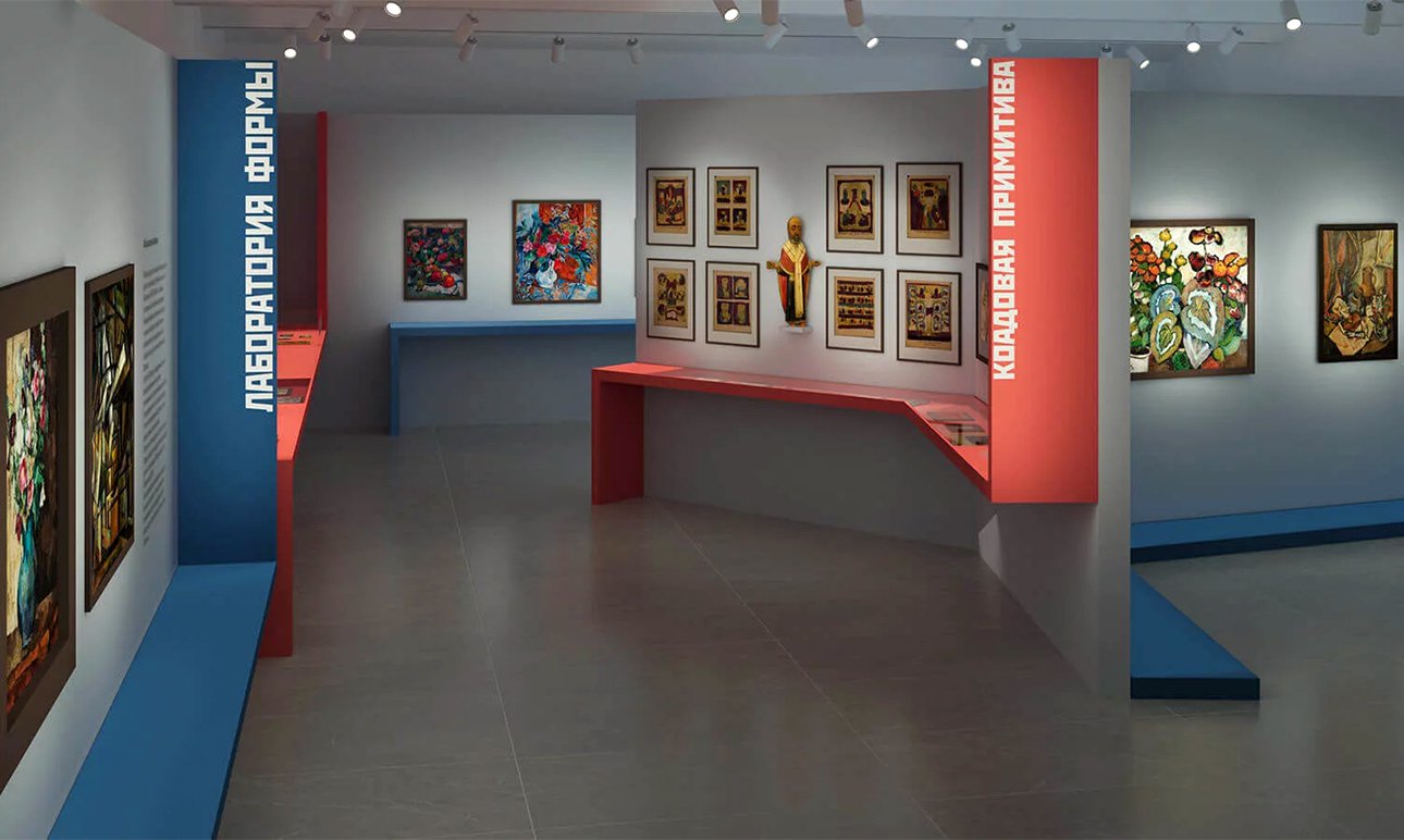 Их сопровождают предметы народного искусства: прялки, деревянные скульптуры, лубки. Любопытно было увидеть большую витрину с «народными гравюрами», выпускавшимися в печатне Алексея Морозова. Их характерная черта — использование анилинового фиолетового красителя (в ту пору недавнего изобретения), который выглядит несколько шокирующе: мы не привыкли видеть народное искусство в таком откровенно химическом колорите. Тут бы повесить рядом соответствующие картины Гончаровой, потому что лубки Морозова становятся внезапной разгадкой, ответом на вопрос, откуда в ее «иконописных» работах часто встречается такой «нерусский» цвет. Но этого не происходит, а оформление архитектором стен в этой зоне красным окончательно убивает интригу.