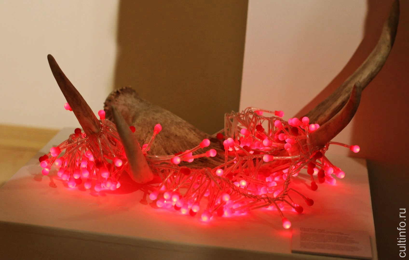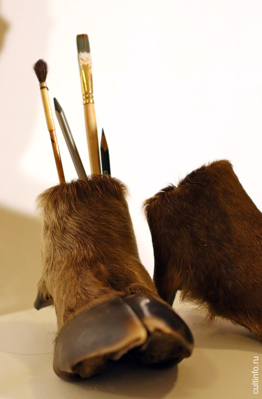 Елена Логинова – график и художник-дизайнер из Череповца, член Союза художников России. В своей инсталляции «Реинкарнация» она играет с границами восприятия: копыта, которые могут ассоциироваться с чем-то мрачным и запретным, превращаются в мирную, даже бытовую вещь — пенал для кистей. Работа отсылает к сказочным мотивам, где темные силы, первобытные страхи и инстинкты становятся частью пути героя, а их преодоление ведет к торжеству добра. Это пронзительное преображение, в котором остается лишь воспоминание о пройденных испытаниях.