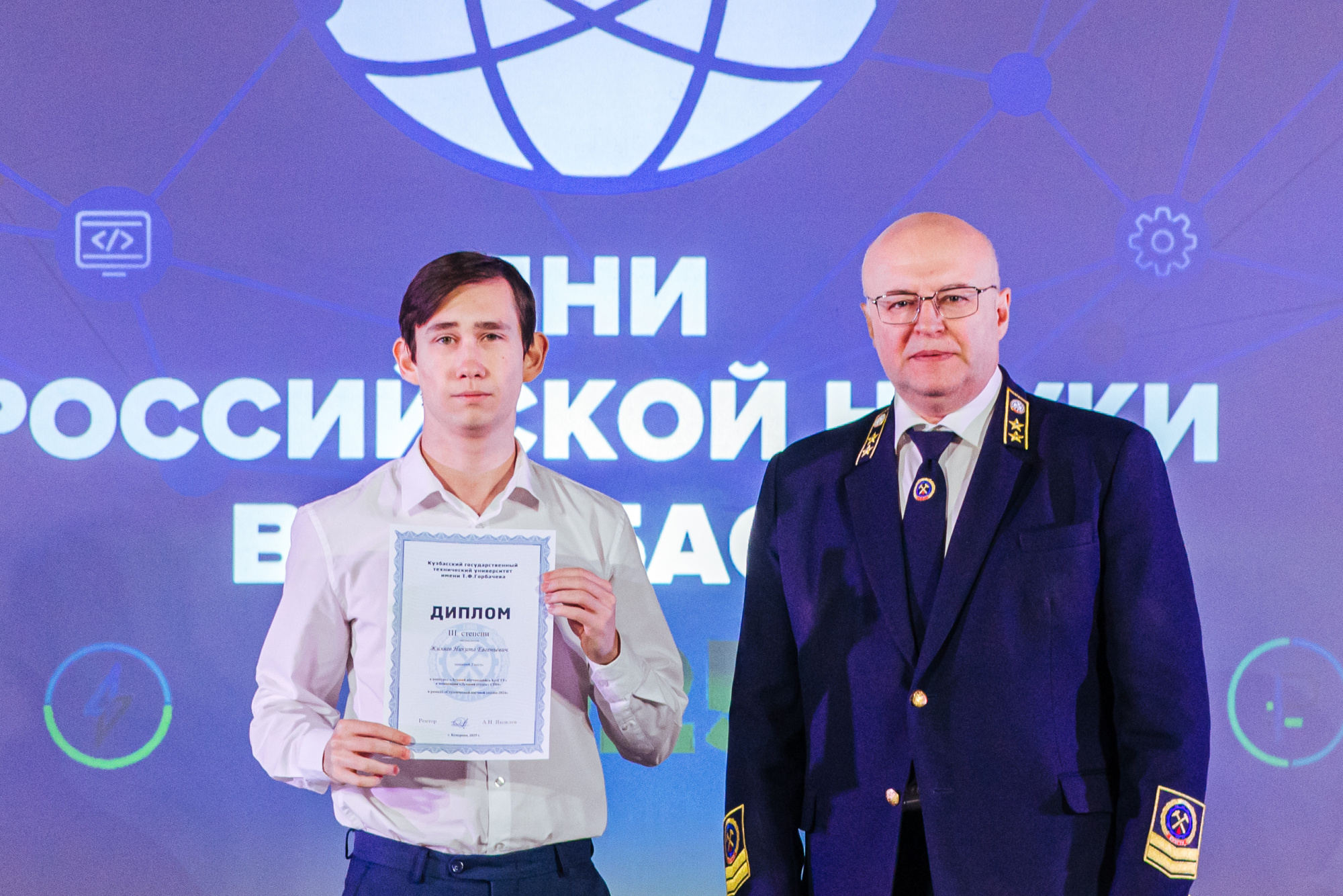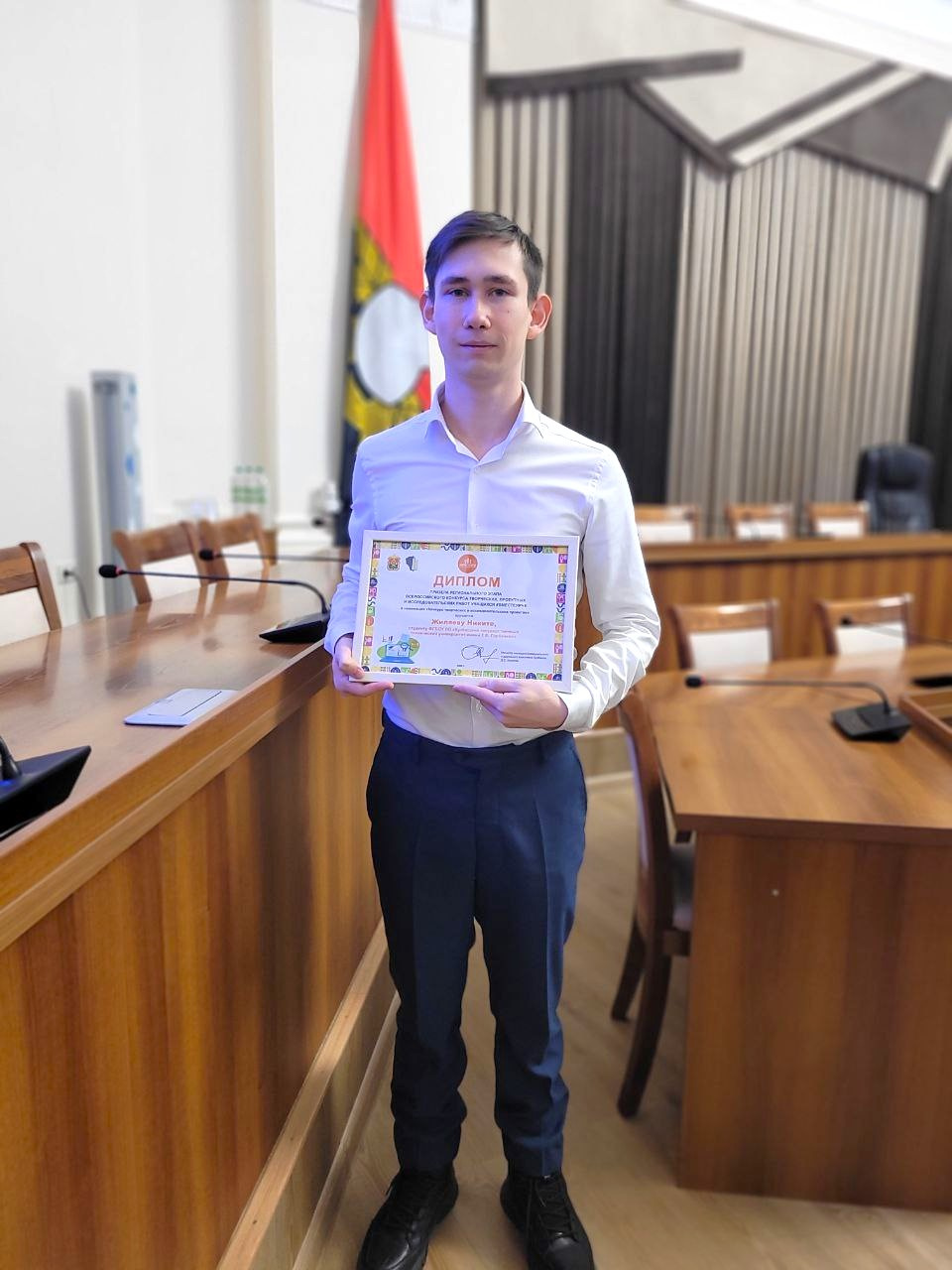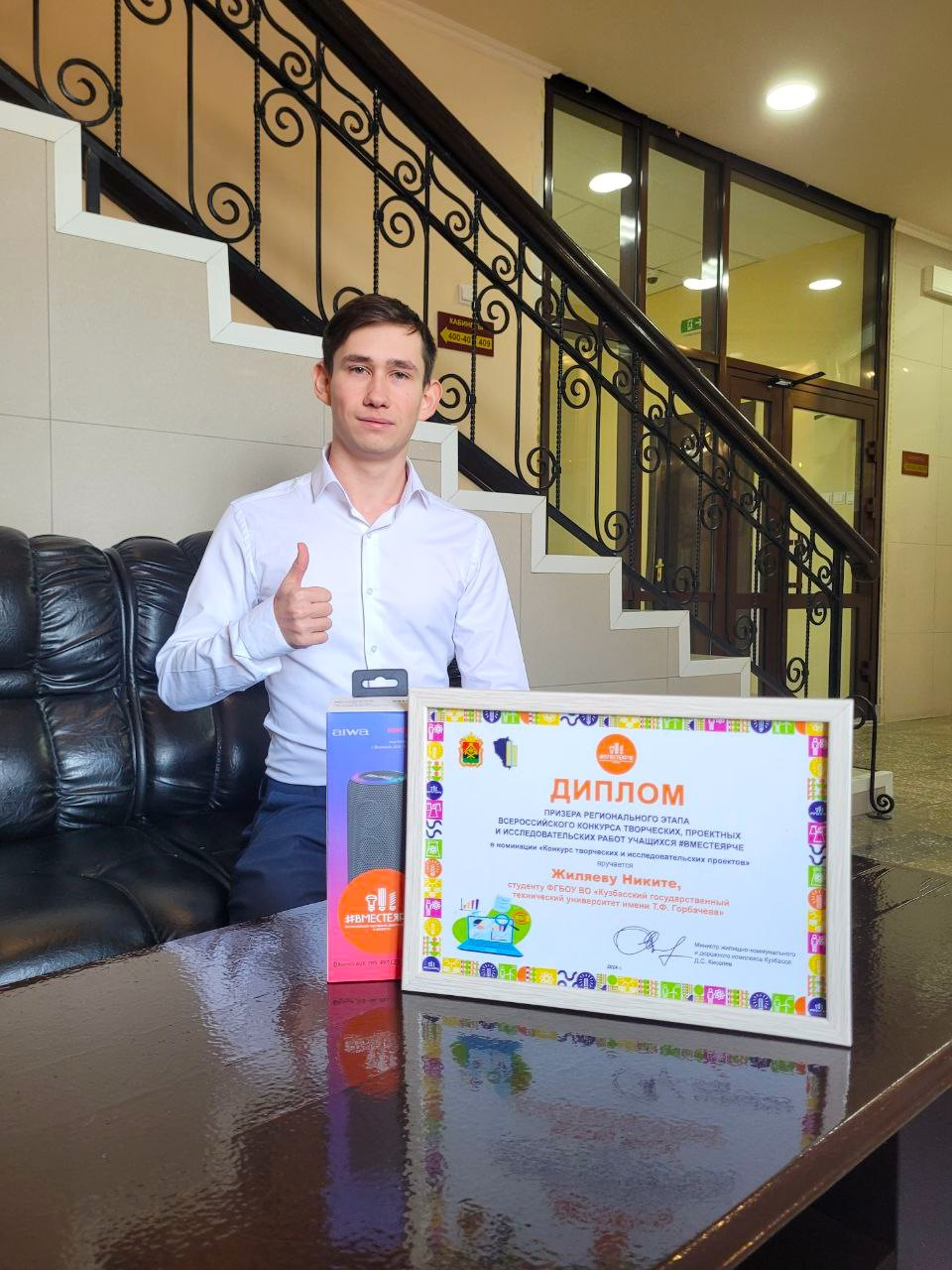 В администрации города Кемерово 12 марта прошла церемония награждения победителей и призёров регионального этапа Всероссийского конкурса «#Вместе ярче». В их числе – второкурсник института профессионального образования Никита Жиляев. Проект студента «Зелёная электроэнергия от МГЭС» занял третье место в номинации «Конкурс творческих и исследовательских проектов». Награду Никите вручил заместитель главы города по социальным вопросам Олег Коваленко.