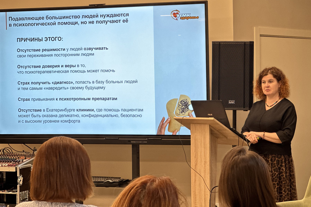 Заместитель главного врача «УГМК-Здоровье» Майя Скляр презентовала площадку, на которой проходило мероприятие. Это первый на Урале негосударственный центр, предлагающий помощь и решение психологических проблем. Здесь проходят терапию пациенты с депрессивными и тревожными расстройствами. Сотрудники предприятий также могут получить поддержку по различным проблемам, включая профессиональное выгорание.