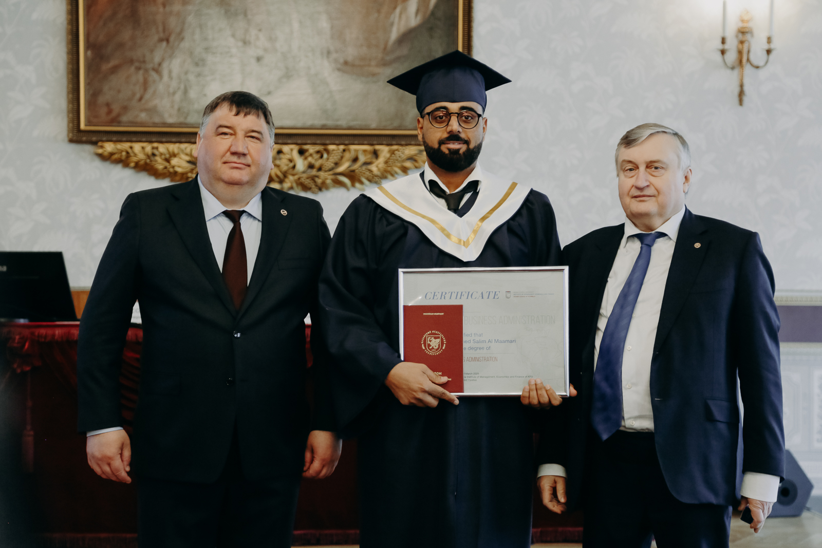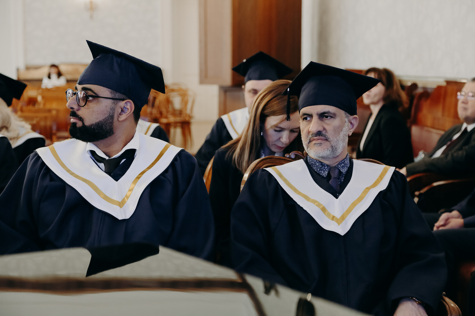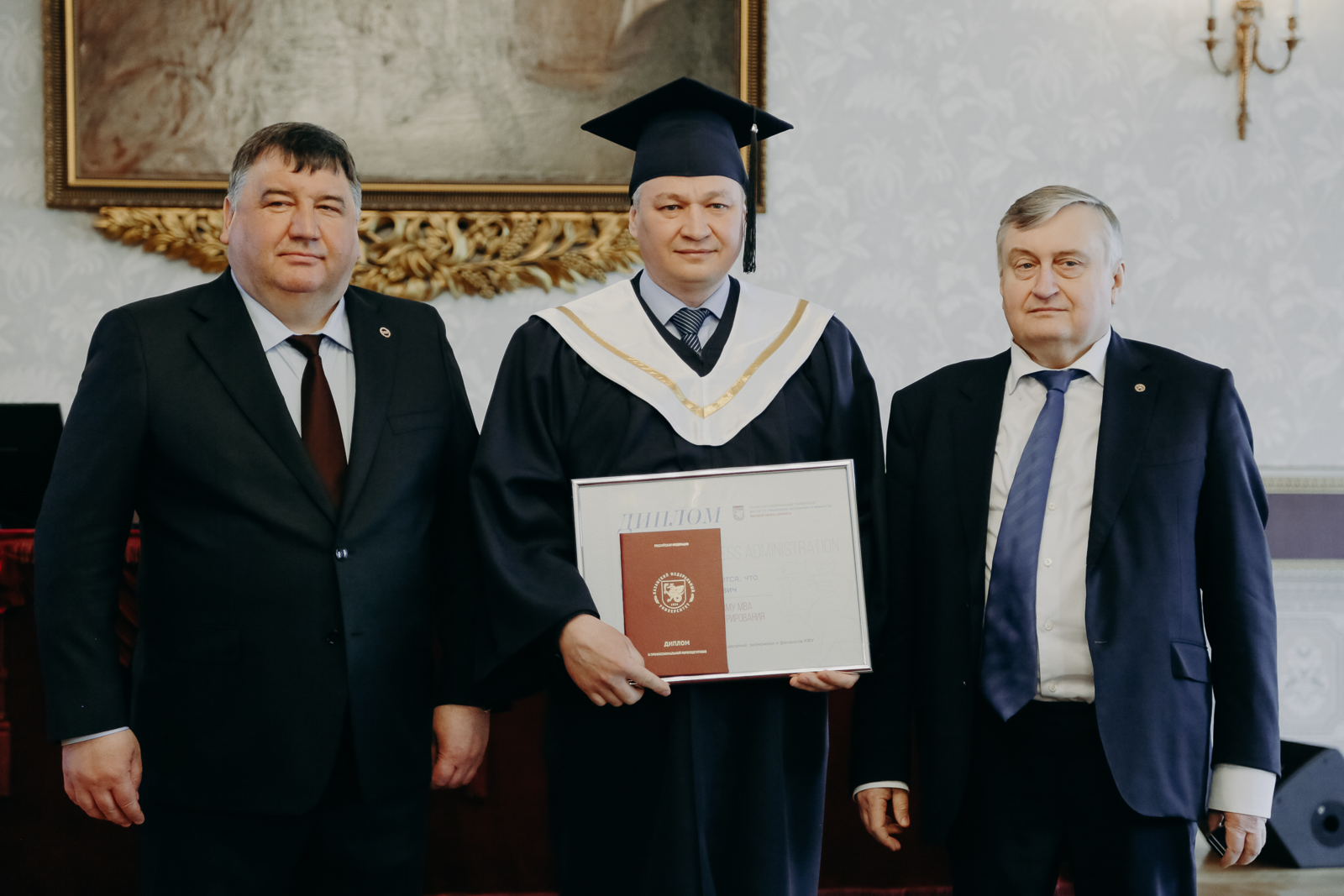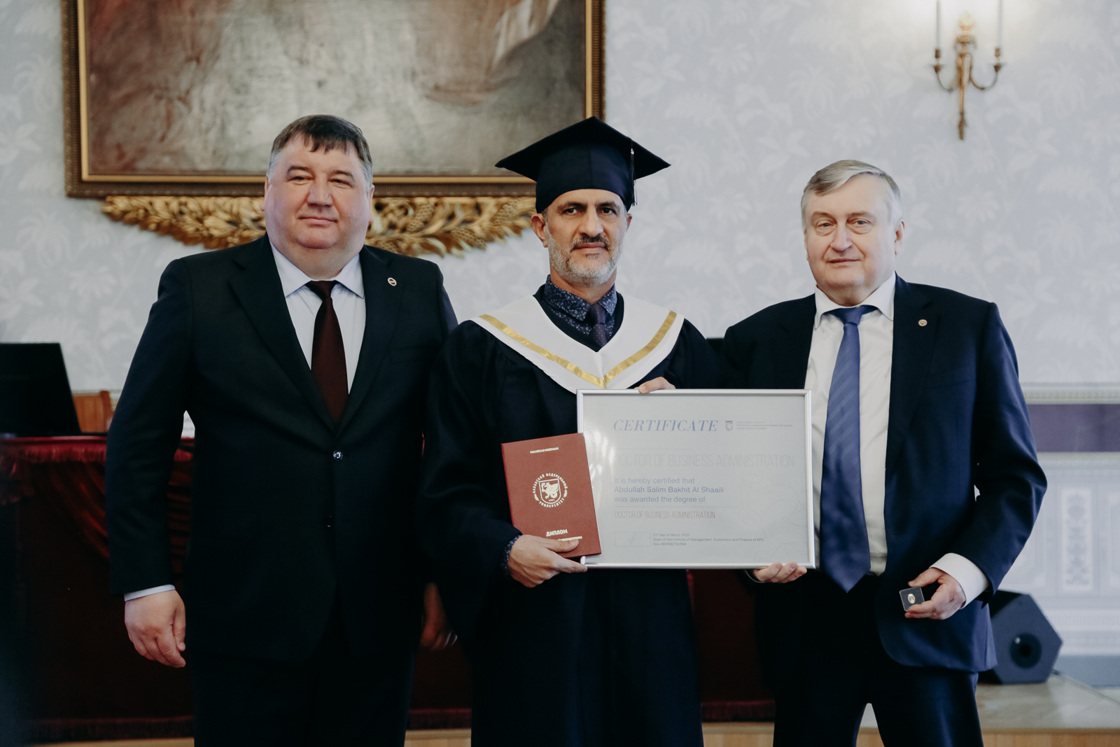 Сегодня дипломы докторов делового администрирования получили два гражданина Султаната Оман – председатель Группы компаний «Аль-Шааили» Абдулла Салим Бахит аль-Шааили и главный инженер Национальной нефтяной инвестиционной компании Омана OQ Джасим Мохаммед Салим аль-Маамари. 32 российским специалистам присвоена степень мастера делового администрирования.