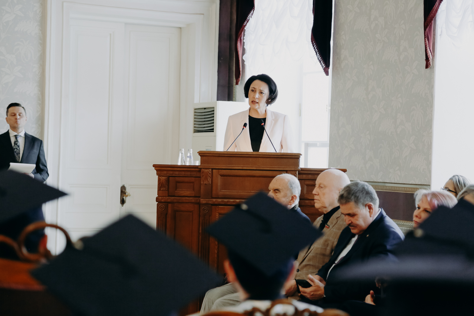 «Мы живем в непростое время перемен, выбора, движения вперед. Это время смелых решений и ярких проектов. Многие работы, которые вы защитили, были именно такими – успехов вам в реализации! Дорогие выпускники, хочу поблагодарить вас за ответственный подход к учебному процессу, за успешную защиту выпускных проектов и пожелать вам применять полученные знания и те управленческие инструменты, которые вы освоили, в своей профессиональной деятельности, гордо носить признанные во всем мире степени MBA и DBA», – говорит Ахметшина.