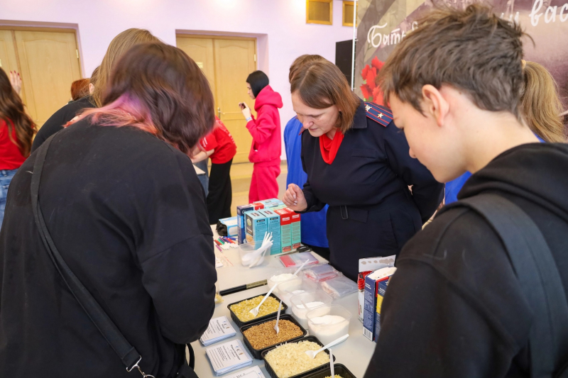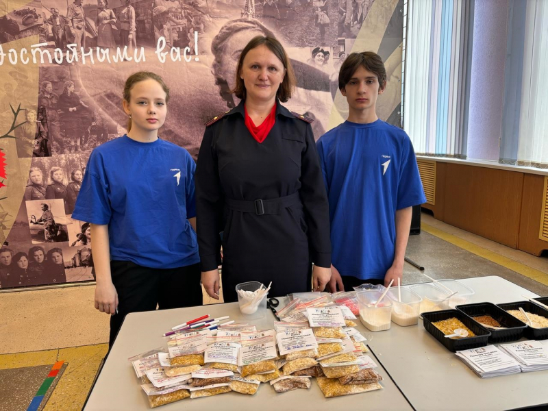 Так, начальник отделения по делам несовершеннолетних Курганского линейного отдела майор полиции Светлана Сергеева совместно с помощником Курганского транспортного прокурора юристом 3 класса Любовью Алферовой и волонтерами «Движения Первых» показали, как готовить быстрые каши для бойцов, участвующих в специальной военной операции. Наставники рассказали, что каши, в составе которых есть зерно, сливки, сухое молоко, сахар и соль, можно достаточно быстро приготовить, просто добавив кипяток к сухой смеси. В этом интерактиве приняли участие более 100 школьников, которые собрали более 50 пакетиков быстрой каши, а также 80 наборов сухого душа для использования солдатами в полевых условиях. Кроме того, участники сделали 10 браслетов, 30 открыток и 30 талисманов для бойцов специальной военное операции.