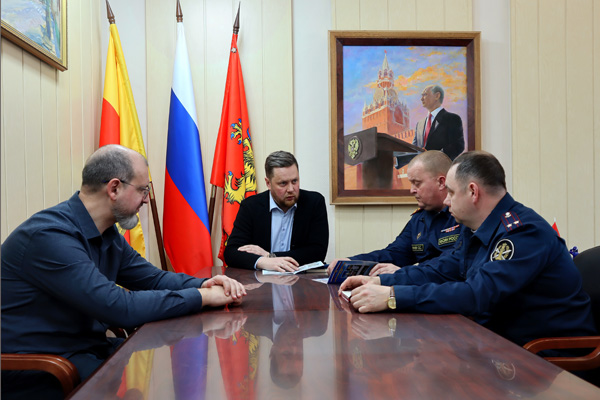 В администрации города Ржева состоялась рабочая встреча, в которой приняли участие начальник ИК-7 полковник внутренней службы Сергей Лисичкин, его заместитель, курирующий производственную деятельность учреждения, подполковник внутренней службы Михаил Смирнов и глава Ржевского муниципального округа Тверской области Роман Крылов.