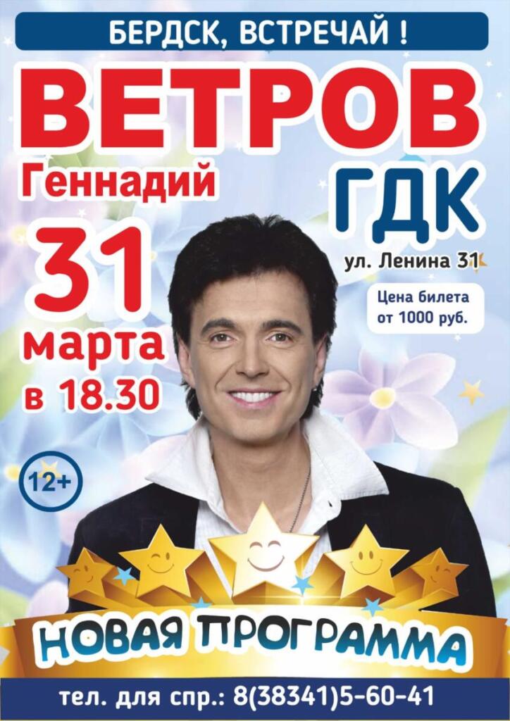 Билеты в продажеВ понедельник, 31 марта, в 18:30 в большом зале ГДК Бердска состоится концерт Геннадия Ветрова.Геннадий Ветров – мастер юмора и талантливый артист. Его концерты всегда полны остроумных шуток,