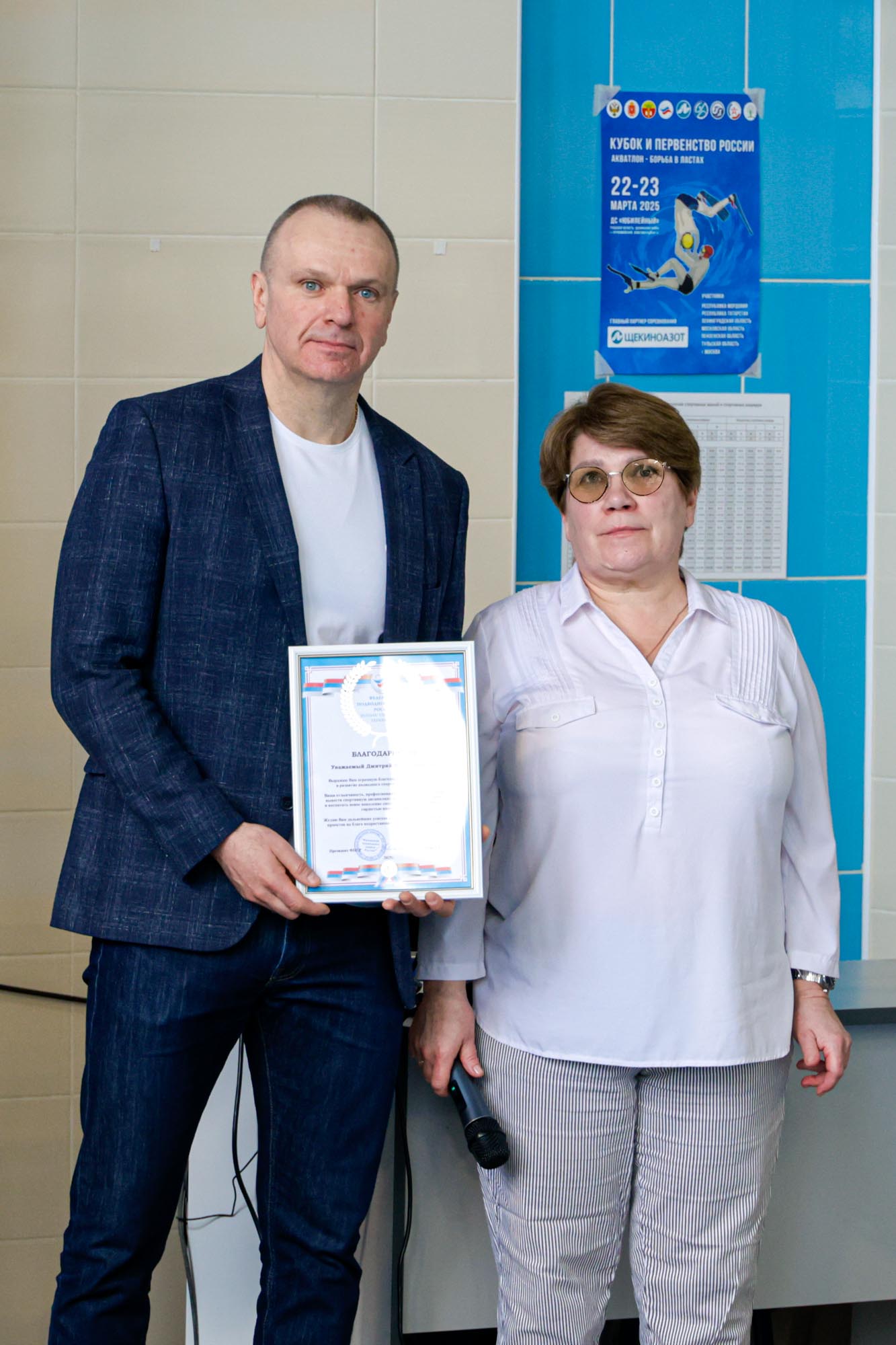 Ирина Кочергина вручила Дмитрию Коженкину Благодарность от имени президента Федерации подводного спорта России Татьяны Карташевой – за развитие акватлона в Тульской области.