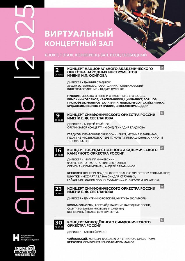 В апреле Виртуальный концертный зал Национальной библиотеки Бурятии вновь распахнет свои двери для зрителей. В этом месяце зрители услышат сказки, песни из мюзиклов, оперетт, мультипликационных, кино- и телефильмов и другие музыкальные шедевры.