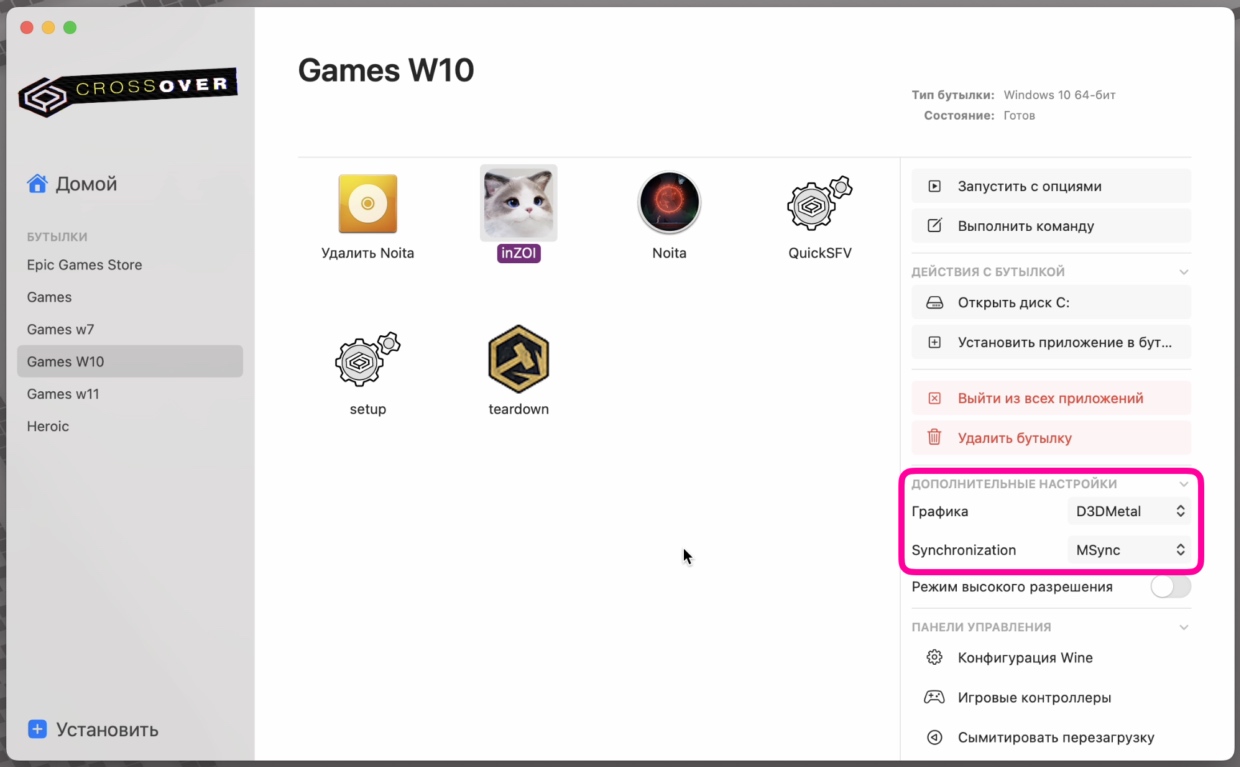 ▪︎ Для этогообязательноустановите в CrossOver режим графикиD3DMetal(это и есть режим Game Porting Tool) и любой режим синхронизации: ESync или MSync, роли не играет.