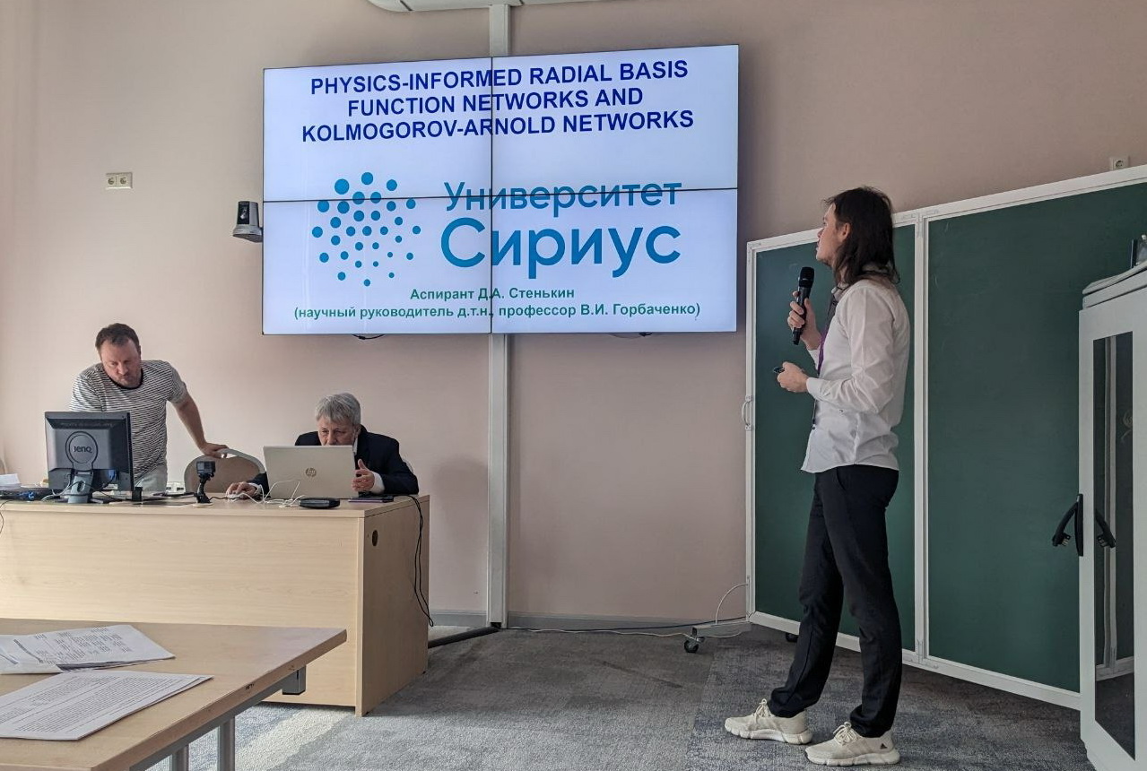Доклад Дмитрия«Physics-informed radial basis function networks and Kolmogorov-Arnold networks» («Физически информированные сети радиальных базисных функций и сети Колмогорова-Арнольда») посвящен разрабатываемому на кафедре «Компьютерные технологии» ПГУ специальному виду нейронных сетей — физически информированным сетям радиальных базисных функций. Научный руководитель — д-р техн. наук, профессор заведующий кафедрой «Компьютерные технологии» ПГУ Владимир Горбаченко.