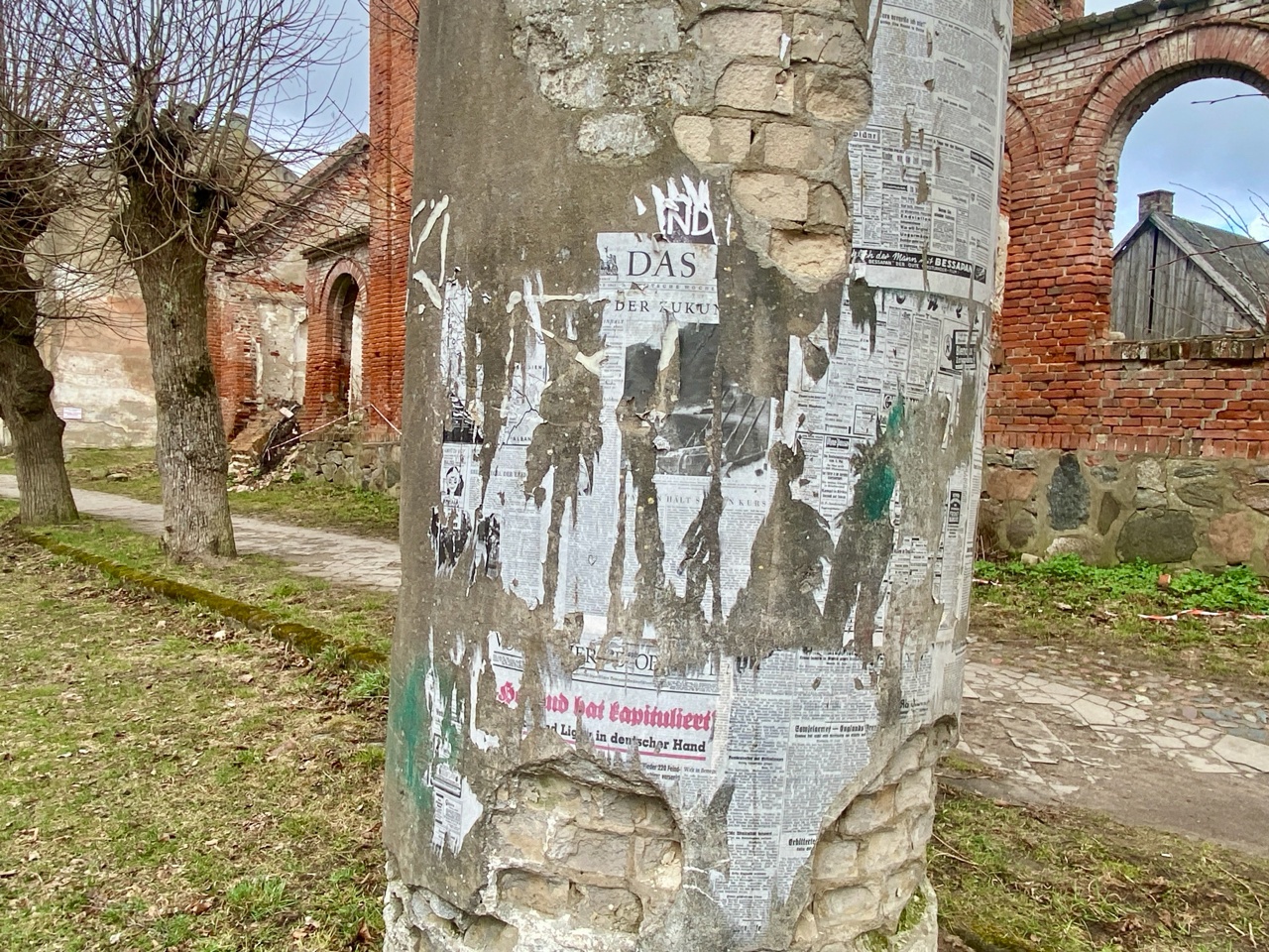 В центре поселка Ясное Славского округа тоже можно увидеть нечто редкое и оригинальное – афишную тумбу. Она стоит рядом с колоритными руинами бывшей приходской школы Каукемен (Ясное), на бывшей Тильзитерштрассе.