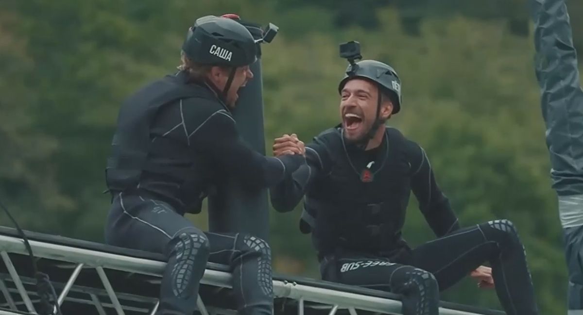 Вторыми были Петр и Александр. Головин спрыгнул, и гамак перевернулся. Актер повис на руках и смог перевернуться обратно. Затем Романов собрался и аккуратно спрыгнул на первый гамак. Дальше партнерам удалось синхронизироваться, и они прошли полосу препятствий.