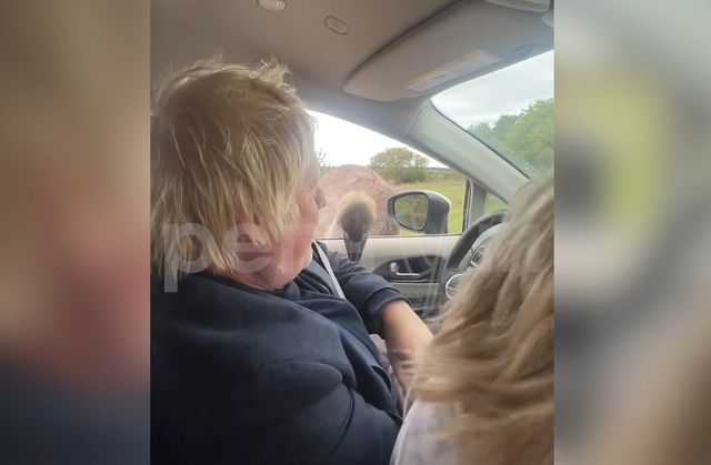 На кадрах видно, как Джонсон смотрит через открытое окно автомобиля на страуса, который внезапно наклонился к нему и ущипнул за руку, заставив экс-премьера выругаться.
