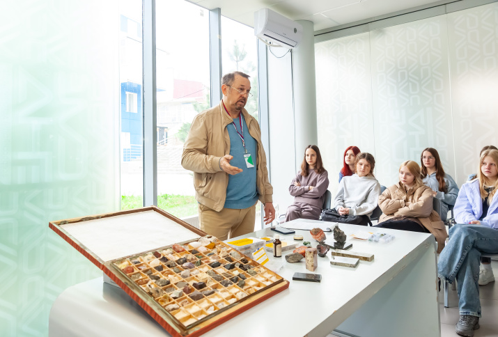 Он познакомил ребят с личной коллекцией минералов из различных уголков нашей планеты, пояснил их структуру и физические свойства. В финальной части занятия они пытались самостоятельно определить виды горных пород.