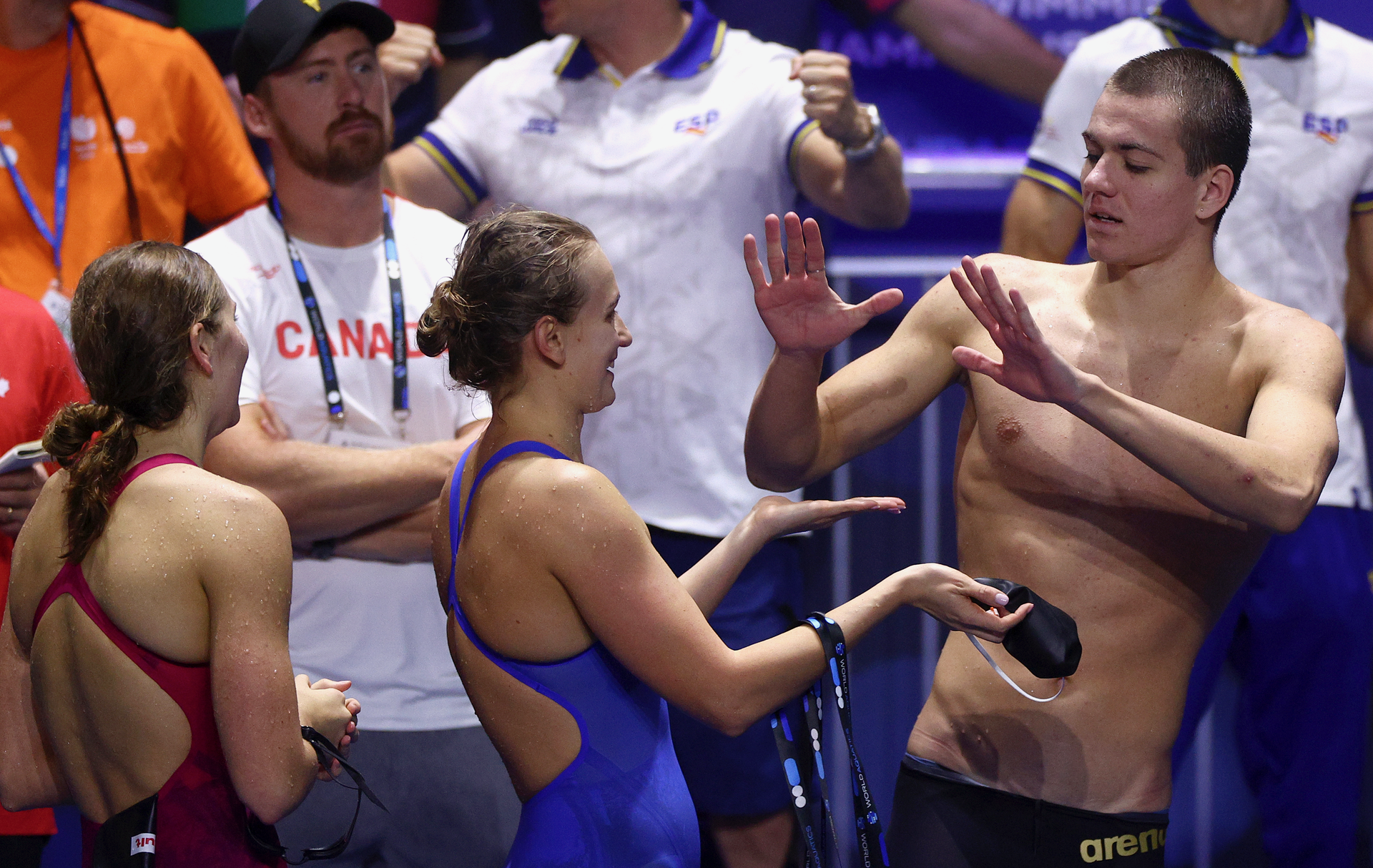 - Арина Суркова, Дарья Клепикова и Мирон Лифинцев на чемпионате мира в Будапеште.