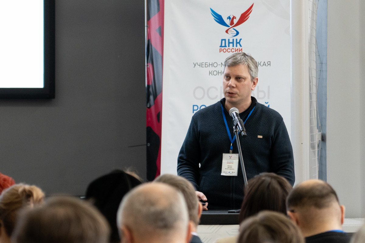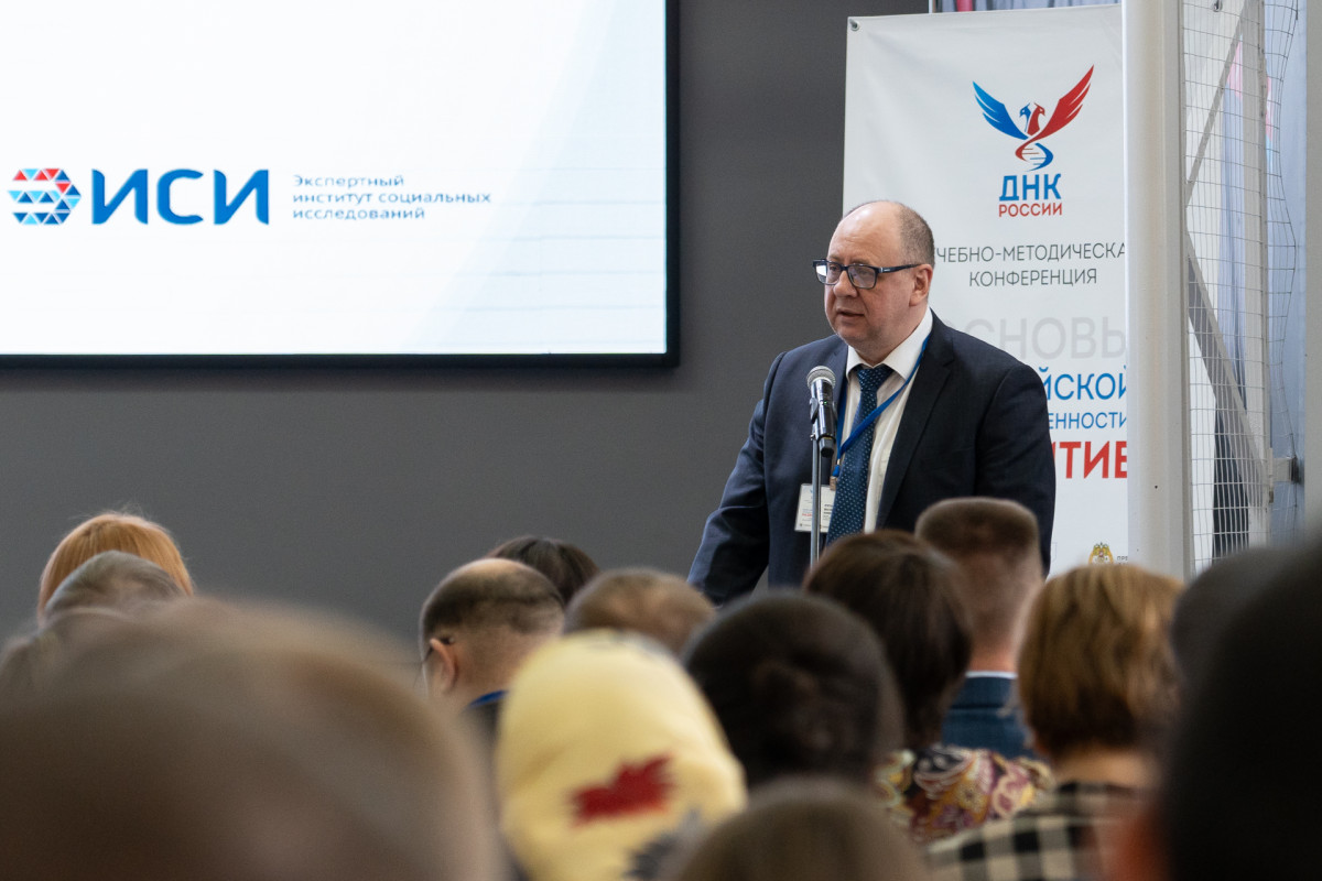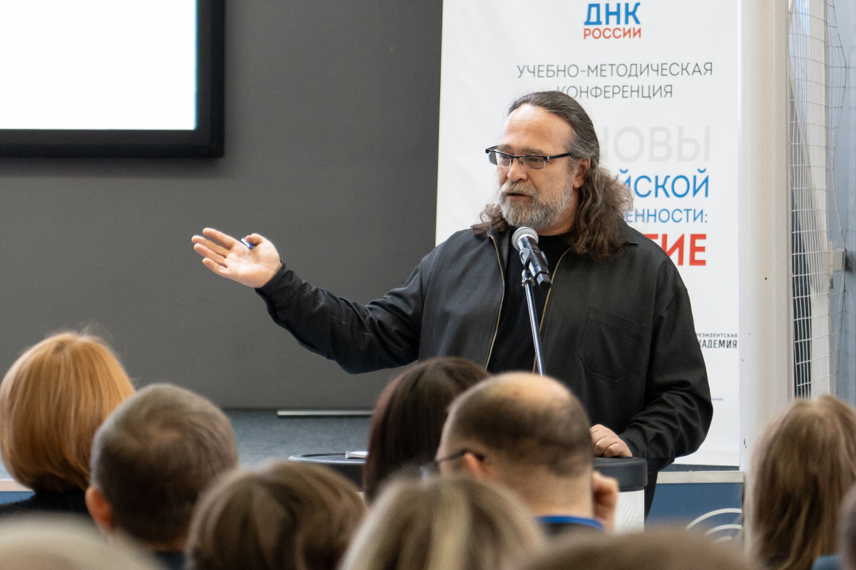 Пленарное заседание открыло выступление проректора РАНХиГС, научного руководителя проекта «ДНК России» Андрея Полосина, одного из авторов учебного пособия «Основы российской государственности». Спикер обозначил вехи создания, раскрыл ключевые положения курса «Основы российской государственности», назвав системный подход к эволюции базовым в понимании содержательно-смыслового наполнения дисциплины. Андрей Полосин также поделился размышлениями о перспективах развития курса ОРГ в системе высшего образования.