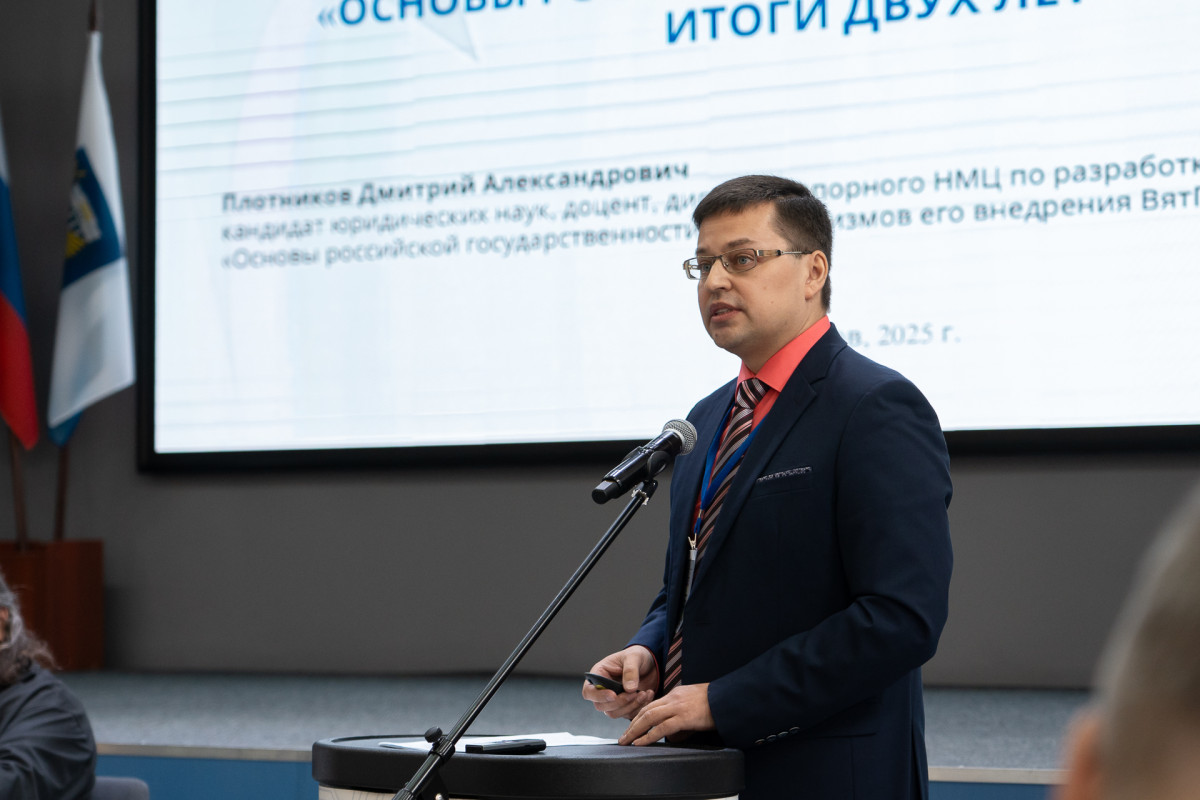 Директор Опорного НМЦ по разработке содержания модуля ОРГ и механизмов его внедрения в ПФО Дмитрий Плотников, доцент ВятГУ, поднял вопросы восприятия курса «Основы российской государственности». В своем докладе он ознакомил аудиторию с результатами социологического опроса, участие в котором приняли 7000 студентов и 150 преподавателей вузов Приволжского федерального округа.