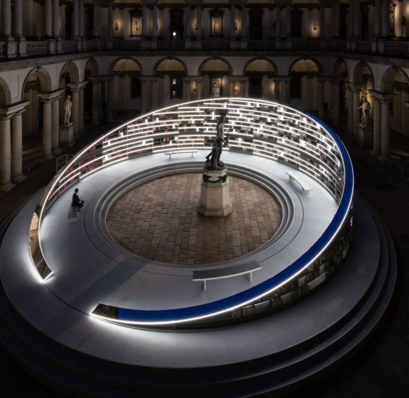 Британский художник-декоратор Эс Девлин создала вращающуюся библиотеку для мебельной выставки Salone del Mobile, которая располагается во дворе исторической галереи Pinacoteca di Brera.