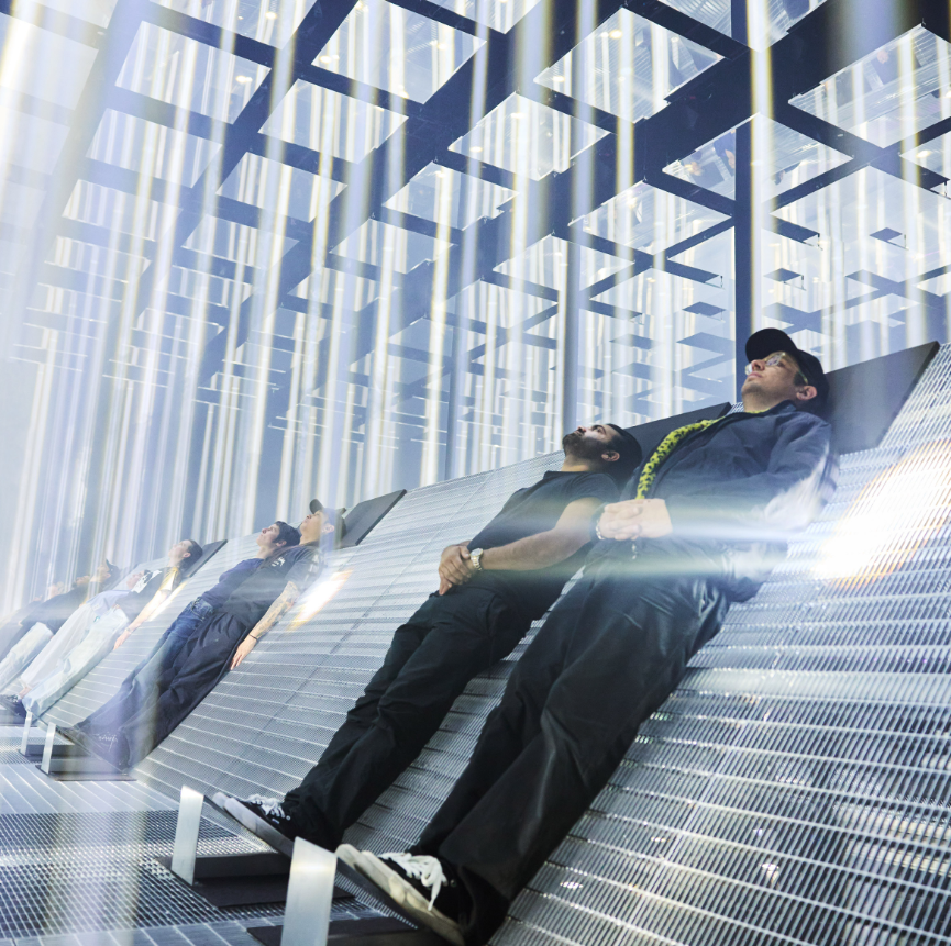 Посетителям предлагается откинуться на металлическую решетку и оставаться неподвижными в течение примерно четырех минут в инсталляции Checkered Future дизайнера Вилло Перрона, который наиболее известен созданием декораций для показов мод Chanel и Savage x Fenty Рианны.