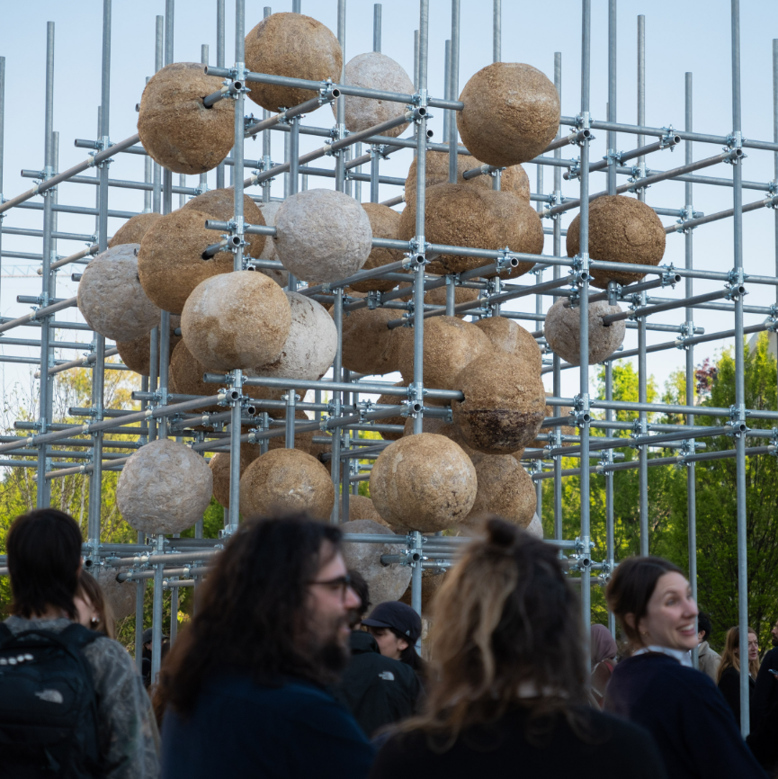 80 подвешенных мицелиевых сфер разложатся, а арендованная конструкция лесов под ними будет возвращена на строительную площадку для повторного использования.