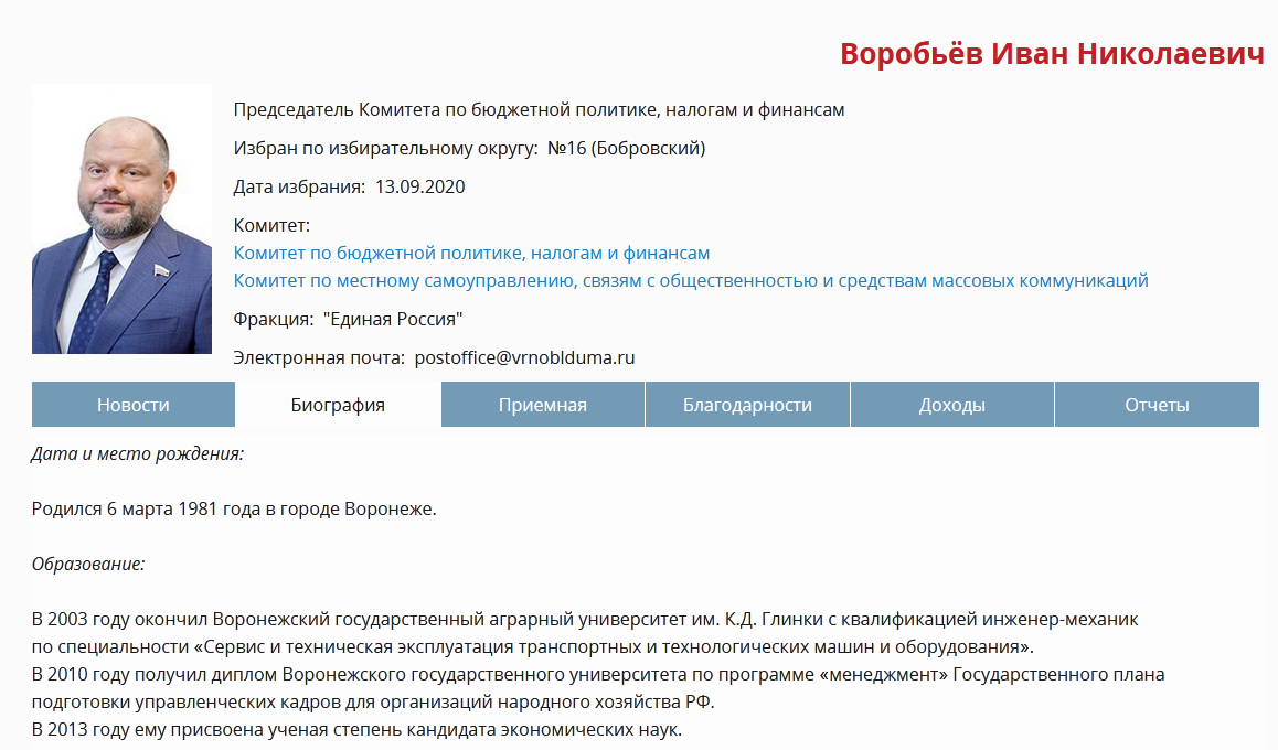 На праймериз «Единой России» в Воронежской области выдвинулся 44-летний депутат облдумы Иван Николаевич Воробьев. Он также является заместителем генерального директора крупной компании ООО «ЭкоНива – Продукты питания». В 2023 году Воробьев занял должность главы финансового комитета облдумы, что по статусу равна посту главы регионального минфина. Причем, как сообщал «Блокнот Воронеж», процедура согласования Ивана Николаевича в то время заняла всего 9 минут.