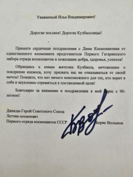 Уроженец Кузбасса летчик-космонавт Борис Волынов передал поздравления жителям области с Днём космонавтики. Об этом в своих социальных сетях сообщил губернатор Илья Середюк.
