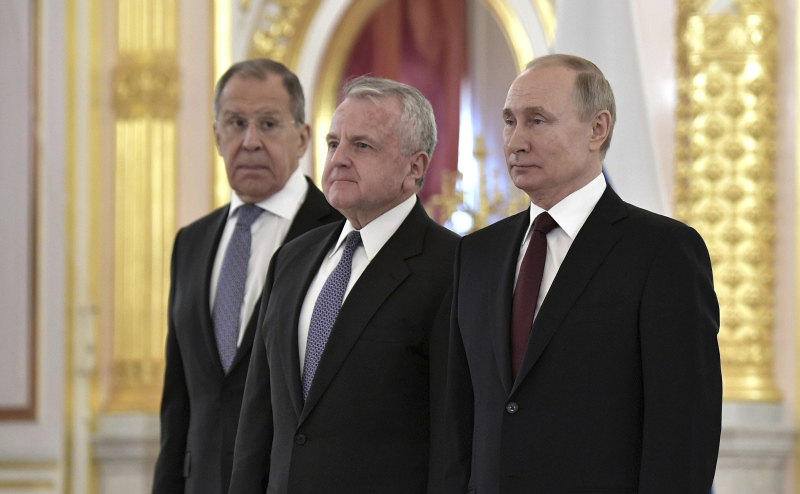 Слева направо: глава МИД России Сергей Лавров, посол (теперь уже бывший) США в Москве Джон Салливан, президент России Владимир Путин. Фото: Alexei Nikolsky/Kremlin Pool/Keystone Press Agency/Global Look Press