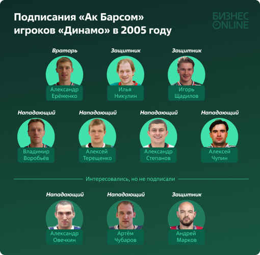 Александр Еременко. Так и не реализовал свой потенциал в «Ак Барсе». Спустя два года Еременко перебрался в «Салават Юлаев», а оттуда — в «Динамо». В родной Москве Александр стал двукратным обладателем Кубка Гагарина.