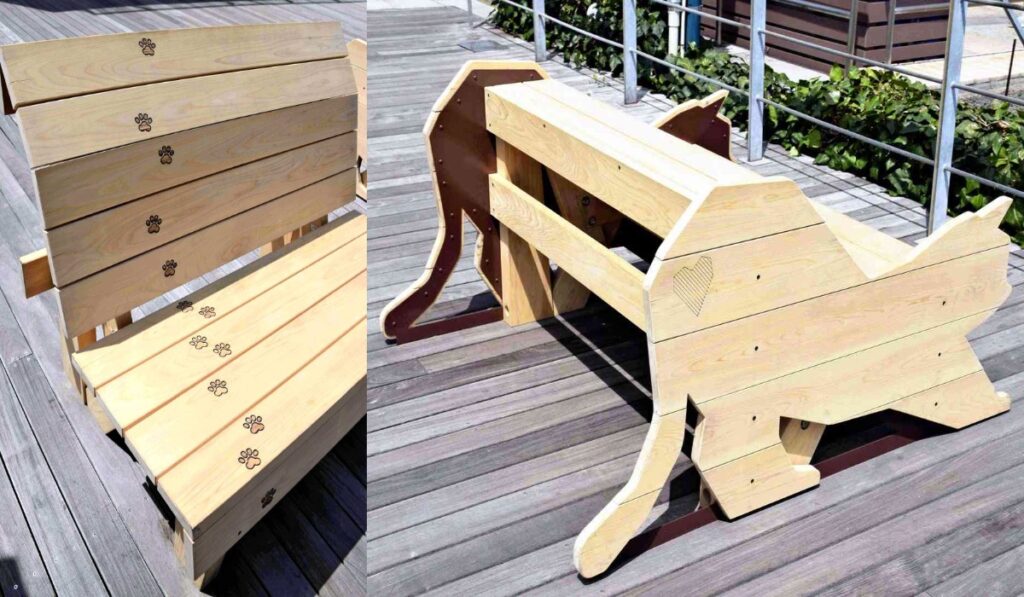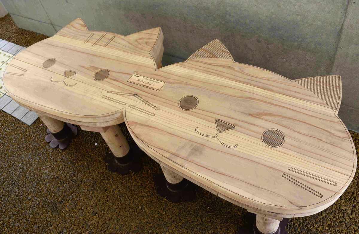 Три двухместные скамейки изготовлены из качественного кипариса и кедра. Общая стоимость изделий обошлась примерно в шесть тысяч долларов. Скамейка под названием «Отпечатки кошачьих лап» длиной 1,2 метра украшена забавными рисунками, идущими от спинки к сиденью. Скамейка «Кошка» длиной 1,4 метра выполнена в виде двух кошачьих мордочек, соединенных посередине. Скамейка «Силуэт кошки» длиной 1,2 метра отличается двумя торцами в форме вытянувшихся котов.