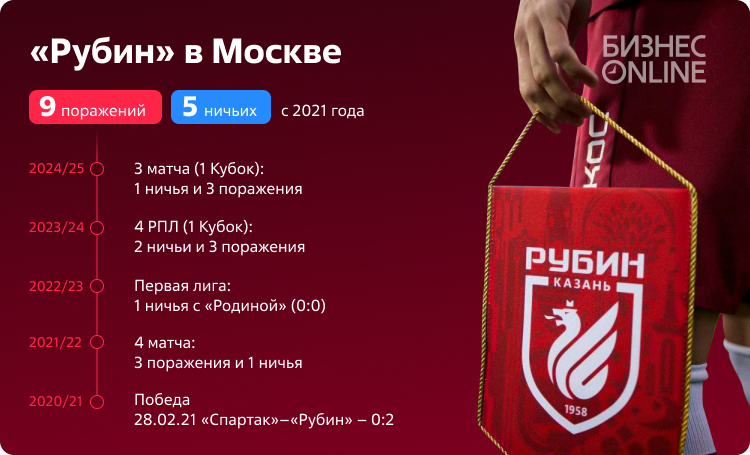 До первой пятерки чемпионата «Рубину» остается 7 очков. И в ближайшее воскресенье казанцам предстоит встретиться с той командой, которая сейчас на пятой позиции. С этого матча в Москве и можно начать рывок за пять туров до конца сезона. Но есть важный нюанс. У «Рубина» за последние годы из рук вон плохо выходят игры в Москве: уже 14 матчей без побед. Шлейф тянется еще с 2021 года, а последним тренером, побеждавшим с «Рубином» на московских полях, был Леонид Слуцкий.