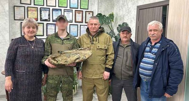 По счастливой случайности Николай приехал в отпуск и в торжественной обстановке директор «АУК» Елена Бахмутова вручила противоосколочный костюм защитнику Отечества.