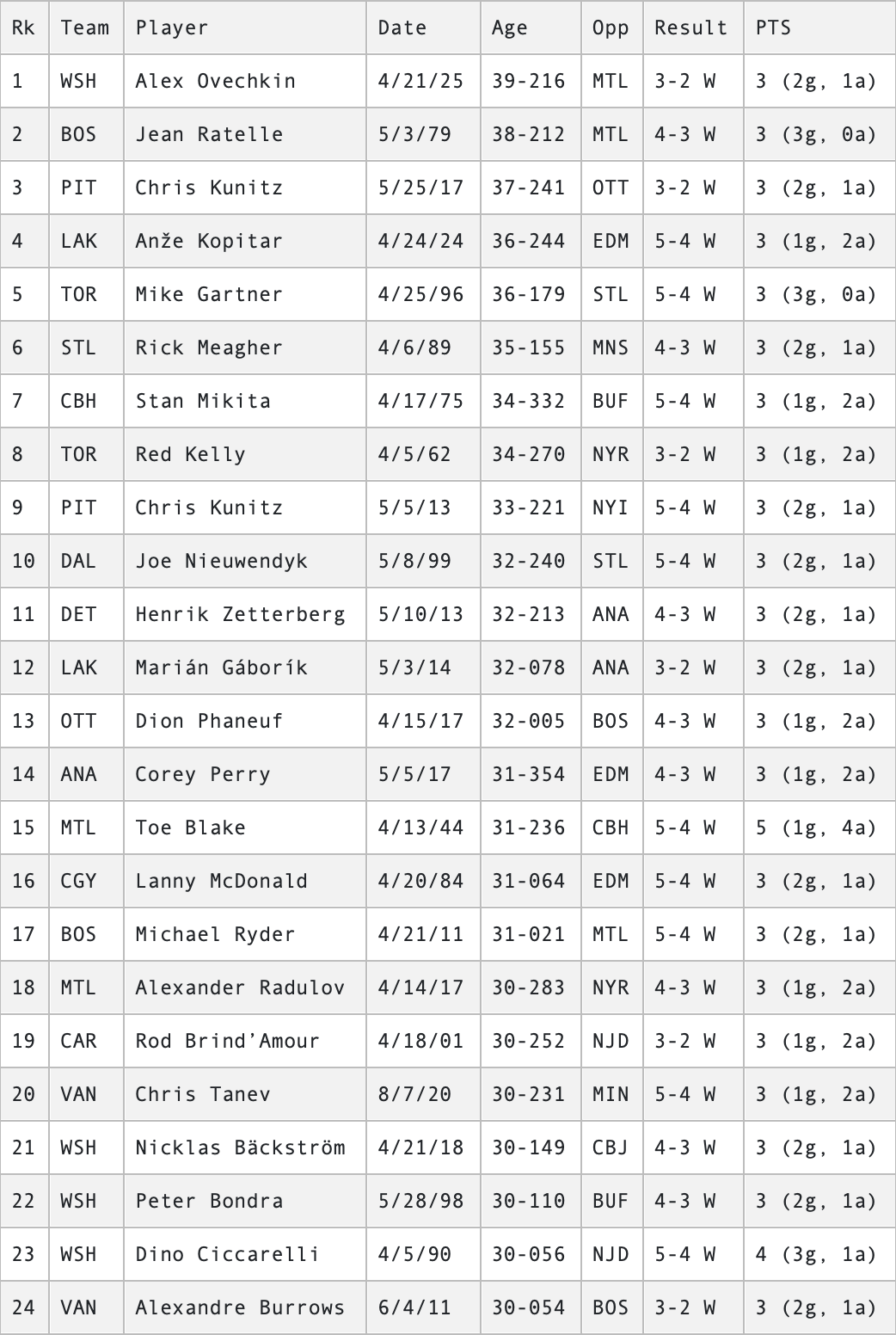 На момент установления рекорда Великой восьмёрке было 39 лет и 216 дней. Он превзошёл достижение Жана Рателя, который 38-летнем возрасте сделал хет-трик в победном матче против «Монреаля» 3 мая 1979 года (4:3 ОТ).