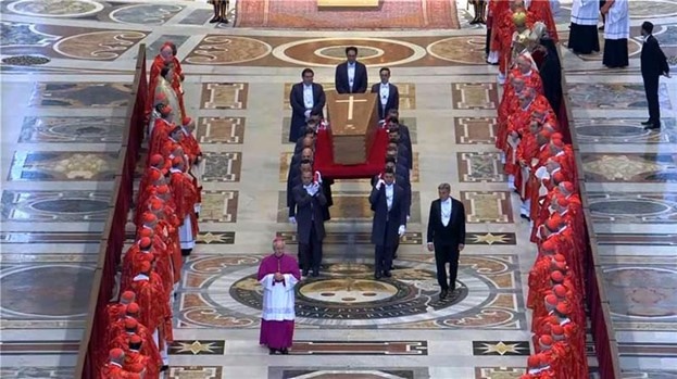 В пасхальный понедельник, 21 апреля 2025 года, Папа Римский Франциск, урожденный Хорхе Марио Бергольо в Аргентине, скончался в возрасте 88 лет в своей резиденции Каса Санта-Марта в Ватикане. Папа Франциск умер от инсульта. Перед этим его выписали из больницы после пяти недель госпитализации с двусторонней пневмонией. Первоначально останки были помещены в гроб в Сент-Марте и выставлены на обозрение нескольким родственникам и высокопоставленным лицам в часовне резиденции, а в среду их перенесли в собор Святого Петра, чтобы католики могли почтить его память перед его гробом, который был открыт для всеобщего обозрения. Со среды по пятницу его гроб посетили более 250 000 человек.