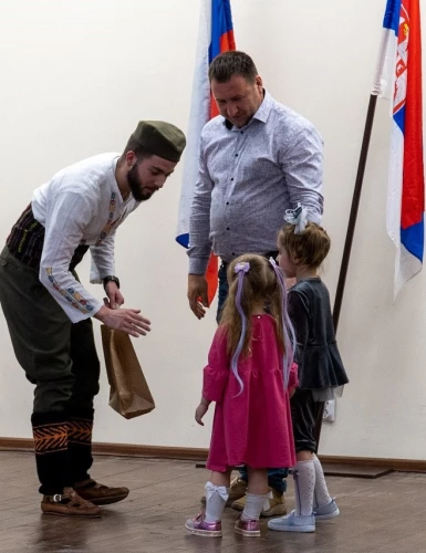 На мероприятии присутствовали сербские студенты Технолога, которые традиционно принимают активное участие в его подготовке. В этот раз они встречали гостей в своих национальных костюмах и вручали детям подарки.