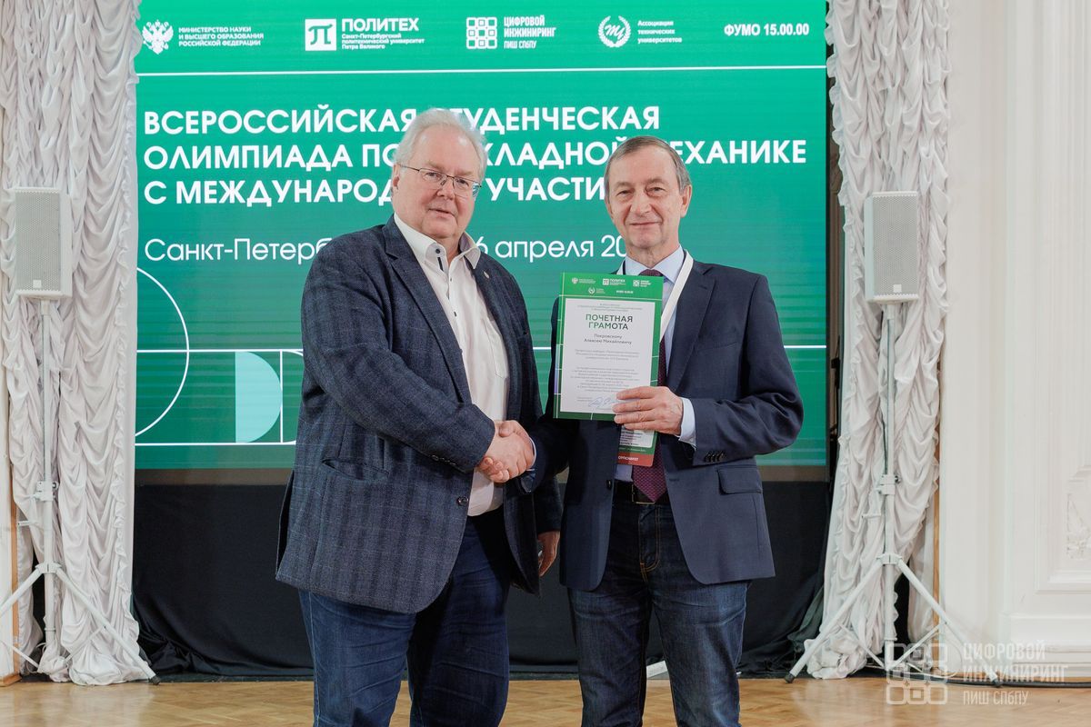 Проректор по цифровой трансформации СПбПУ, руководитель Передовой инженерной школы СПбПУ «Цифровой инжиниринг» Алексей Боровков вручил Почетную грамоту за высокий уровень организации и проведения Всероссийской студенческой олимпиады по прикладной механике с международным участием, а также за активную и плодотворную работу в качестве председателя жюри вручается профессору кафедры «Прикладная механика» МГТУ им. Н.Э. Баумана, руководителю научно-методического совета по направлению «Прикладная механика», многолетнему председателю жюри Олимпиады Алексею Покровскому.