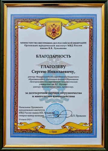 Начальник института генерал-майор полиции Дмитрий Проказин в своем выступлении отметил многолетнее и плодотворное научное взаимодействие ОрЮИ МВД России имени В. В. Лукьянова и БГТУ им. В.Г. Шухова, и рассказал об актуальных направлениях подготовки кадров.