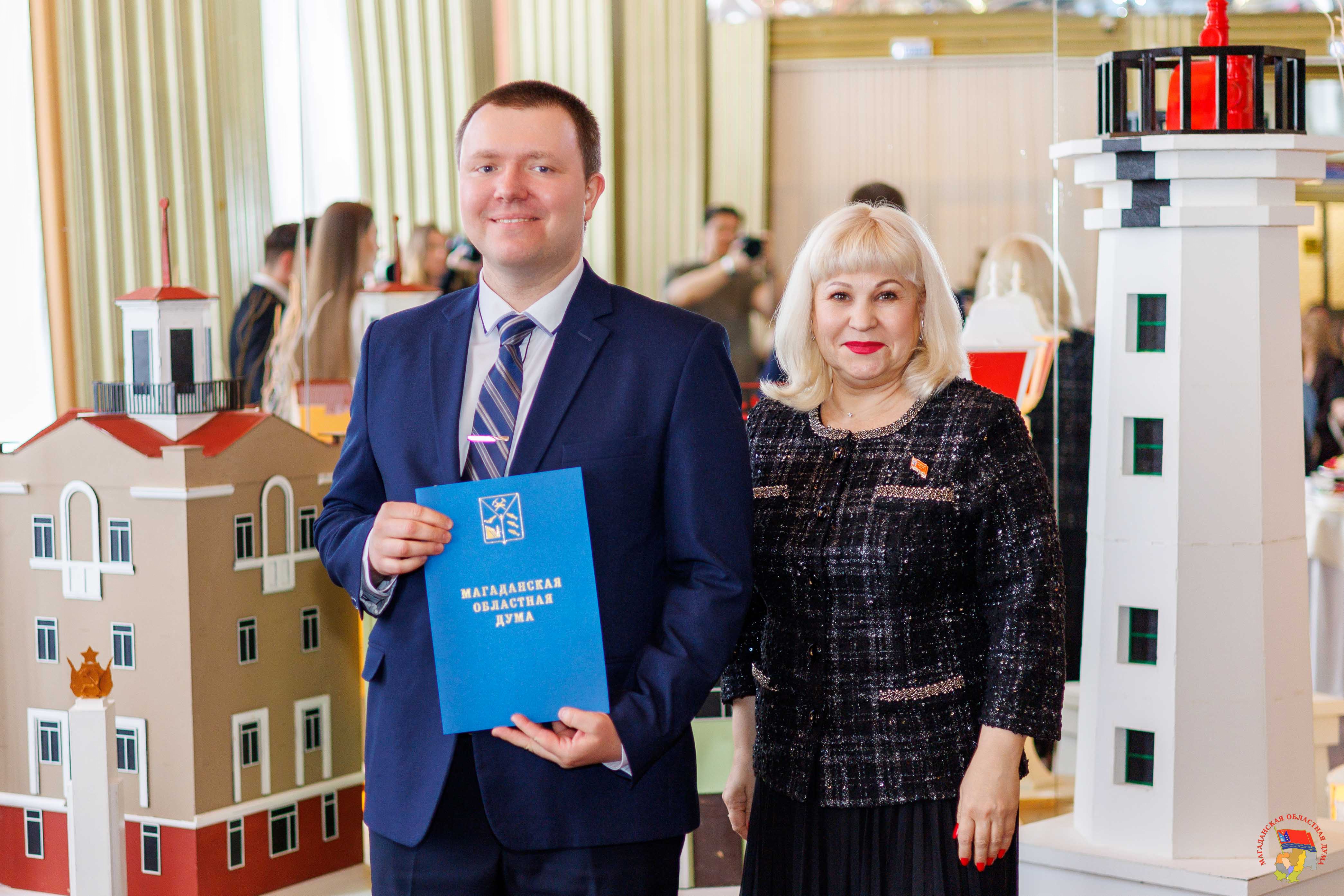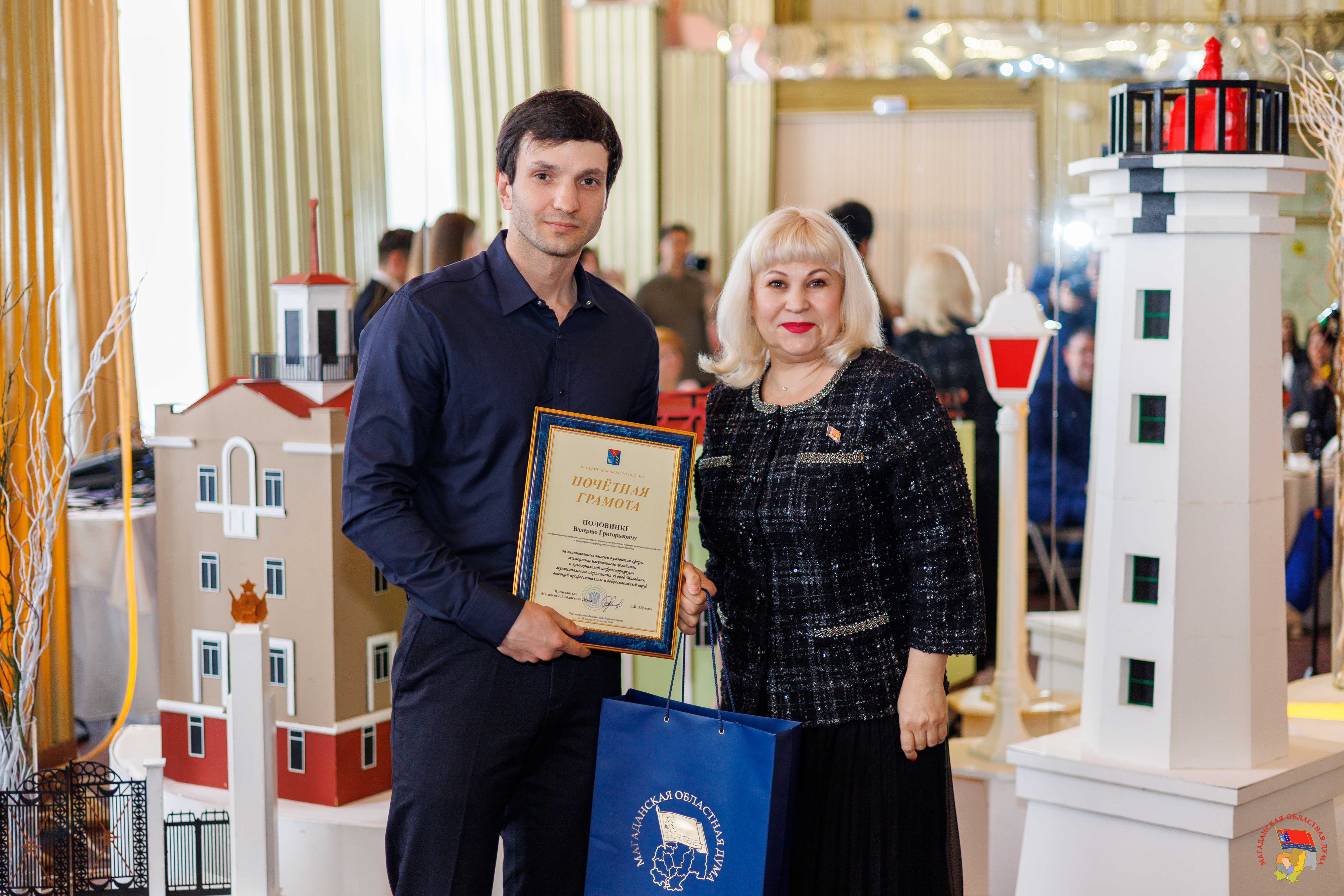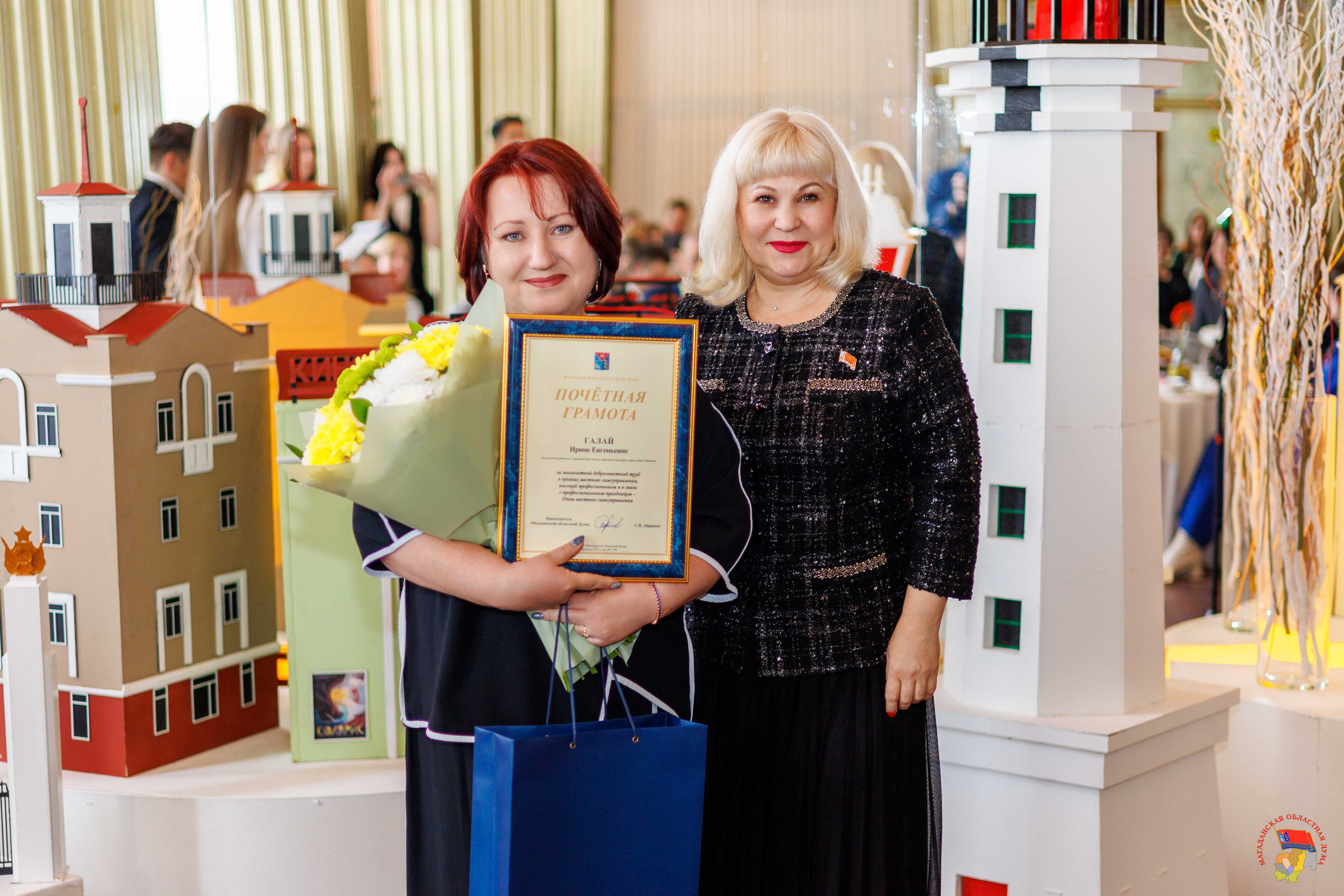 В Магадане состоялось торжественное мероприятие, посвященное Дню местного самоуправления, которое отмечается 21 апреля. Работников муниципального образования «Город Магадан» с праздником поздравили первый заместитель Председателя Магаданской областной Думы Эдуард Козлов, зампред Виктория Голубева, мэр Магадана Лариса Поликанова и заместитель председателя Правительства Магаданской области Юрий Гришан. За значительные заслуги в сфере жилищно-коммунального хозяйства и коммунальной инфраструктуры муниципального образования «Город Магадан» почетными грамотами Магаданской областной Думы были награждены начальник экономико-аналитического отдела департамента ЖКХ Алена Буркацкая и начальник отдела муниципального жилищного контроля департамента ЖКХ Валерий Половинка. Также награду за многолетний и добросовестный труд в органах местного самоуправления получила консультант финансово-экономического отдела управления культуры Мэрии города Магадана Ирина Галай. Благодарственными письмами заксобрания были поощрены консультант управления по делам молодежи и связям с общественностью Станислав Красовский и эксперт финансово-правового отдела управления по делам молодежи и связям с общественностью Ирина Сагирова. Вручая награды, зампред Виктория Голубева поздравила всех причастных с профессиональным праздником: «На плечах муниципальных служащих особая миссия – работа на благо народа. Именно от того, как вы будете взвешено принимать решения и выполнять поставленные задачи, будет зависеть уровень комфорта жизни колымчан. Желаю вам крепкого здоровья, счастья и удачи!». Также на торжественном собрании были вручены награды мэрии Магадана, объявлены почетные работники разных сфер и лучшие муниципальные служащие. Звание «Отличник муниципальной службы» было присвоено заместителю руководителя аппарата Магаданской городской Думы Снежане Вандышевой, начальнику отдела по муниципальной службе гордумы Елене Лысюк, руководителю департамента образования Алексею Юрздицкому, начальнику отдела общего образования департамента образования Анне Кашниковой, главному специалисту отдела дошкольного образования департамента образования Елене Полищук. Знаки отличия «За заслуги перед городом Магаданом» вручили вице-спикеру заксобрания Колымы Эдуарду Козлову и руководителю аппарата гордумы Елене Середе. «Пусть время, которое вы посвятили муниципальной службе, будет тем периодом жизни, которым впоследствии вы будете гордиться, - обратился к собравшимся парламентарий. – Пусть все ваши начинания, направленные на улучшение жизни в городе, находят положительный отклик от магаданцев». Кроме того, знаком Всероссийской ассоциации развития местного самоуправления были отмечены заместитель мэра города Магадана Евгения Тихомирова и начальник отдела опеки и попечительства департамента образования Галина Паньшина. Медаль ВАРМСУ за развитие местного самоуправления вручили первому заместителю мэра города Магадана Александру Малашевскому.