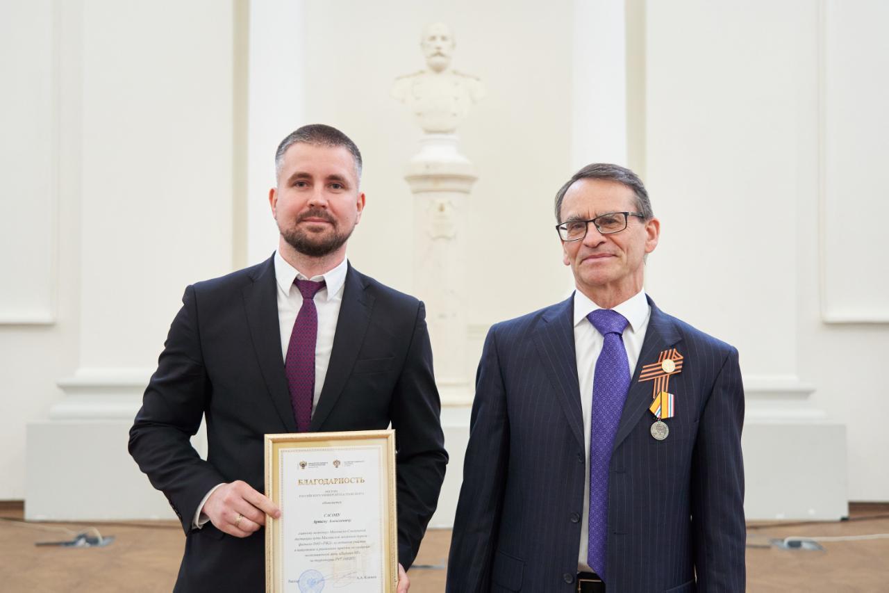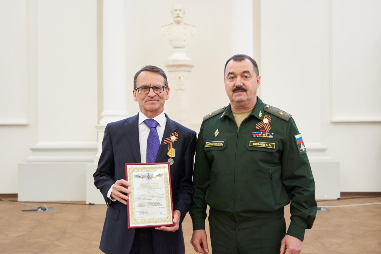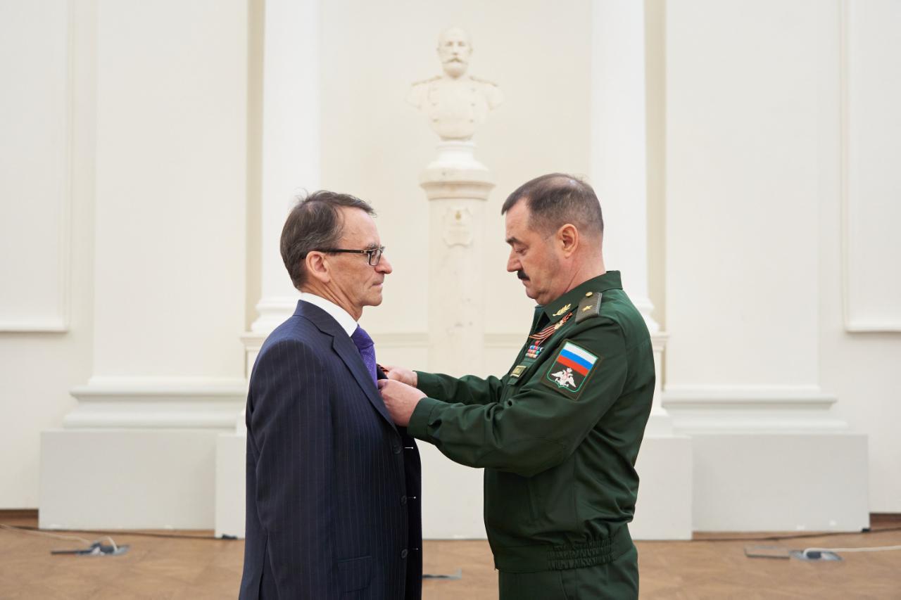 Одним из главных событий стало вручение ректору Александру Климову медали Министерства обороны РФ «За помощь и милосердие» — за личные заслуги в поддержке военнослужащих. Награду передал начальник Военного учебного центра РУТ генерал-майор Андрей Козлов.
