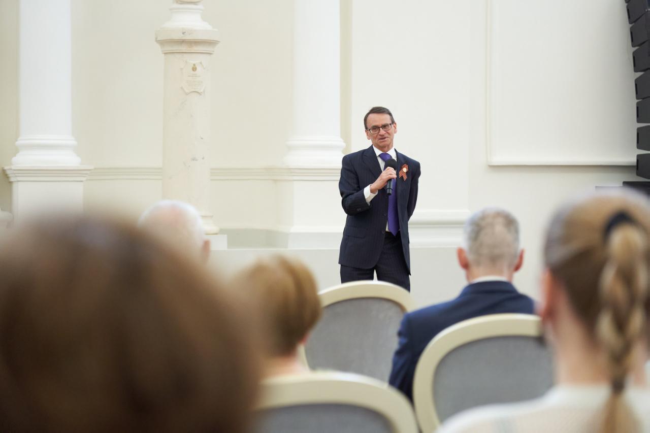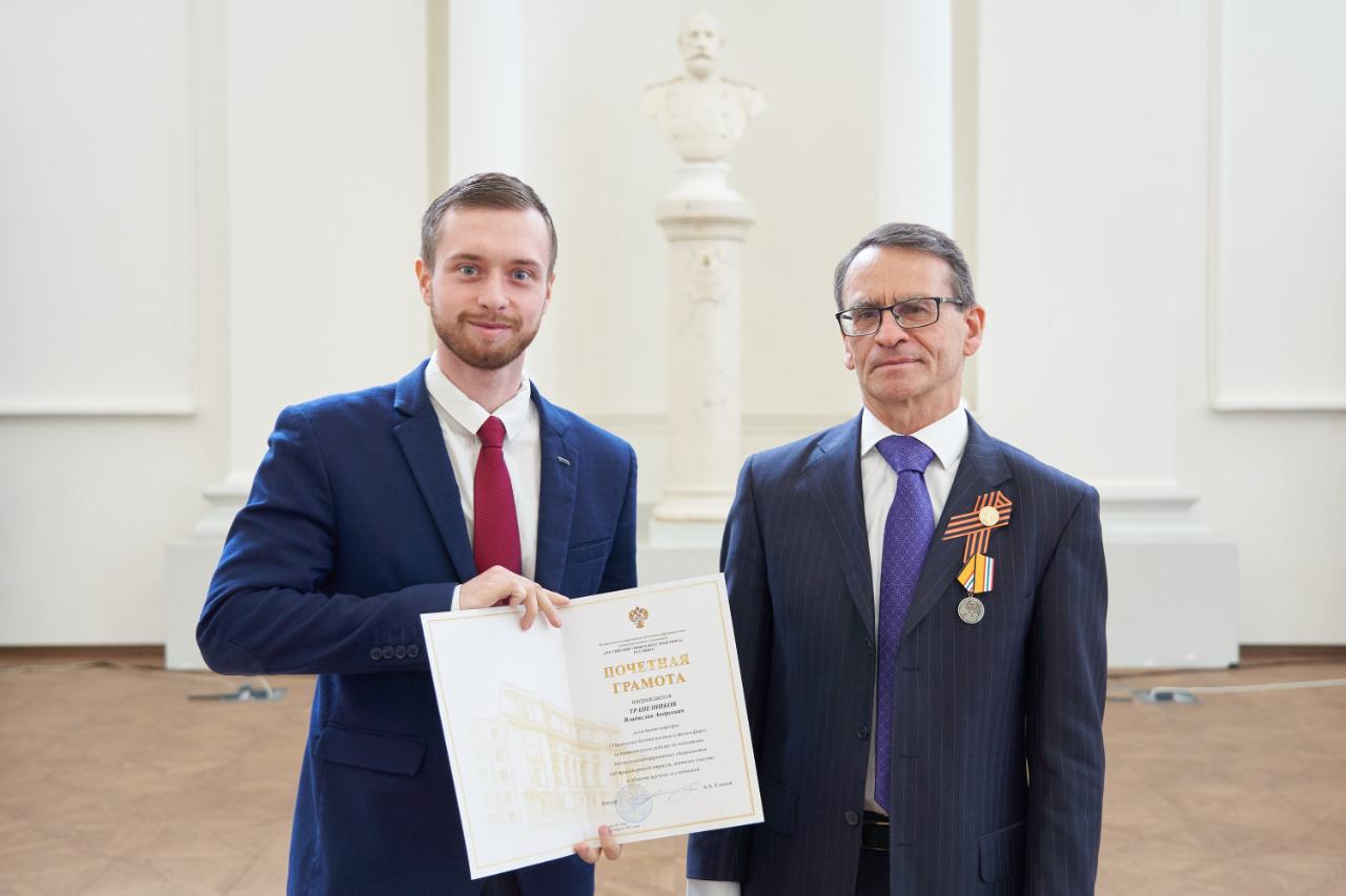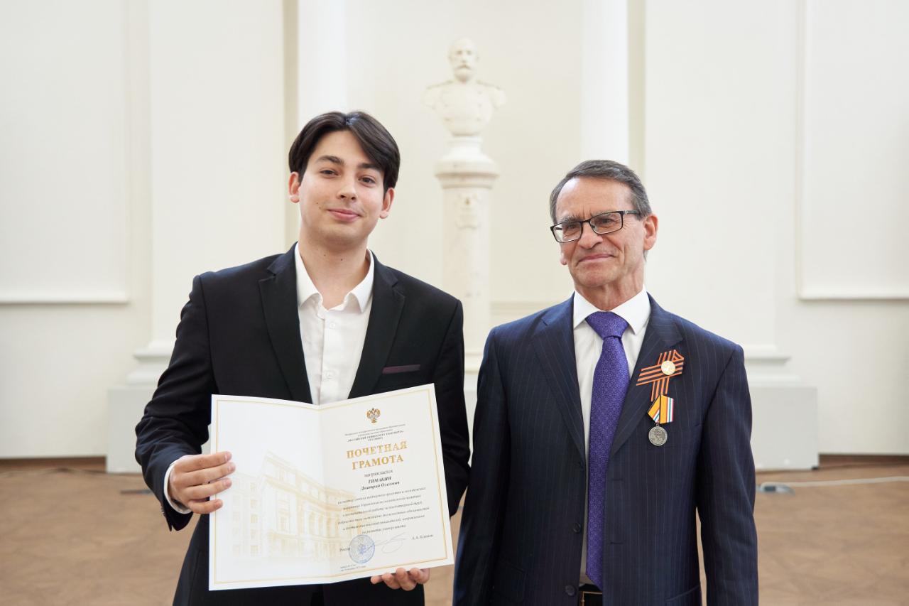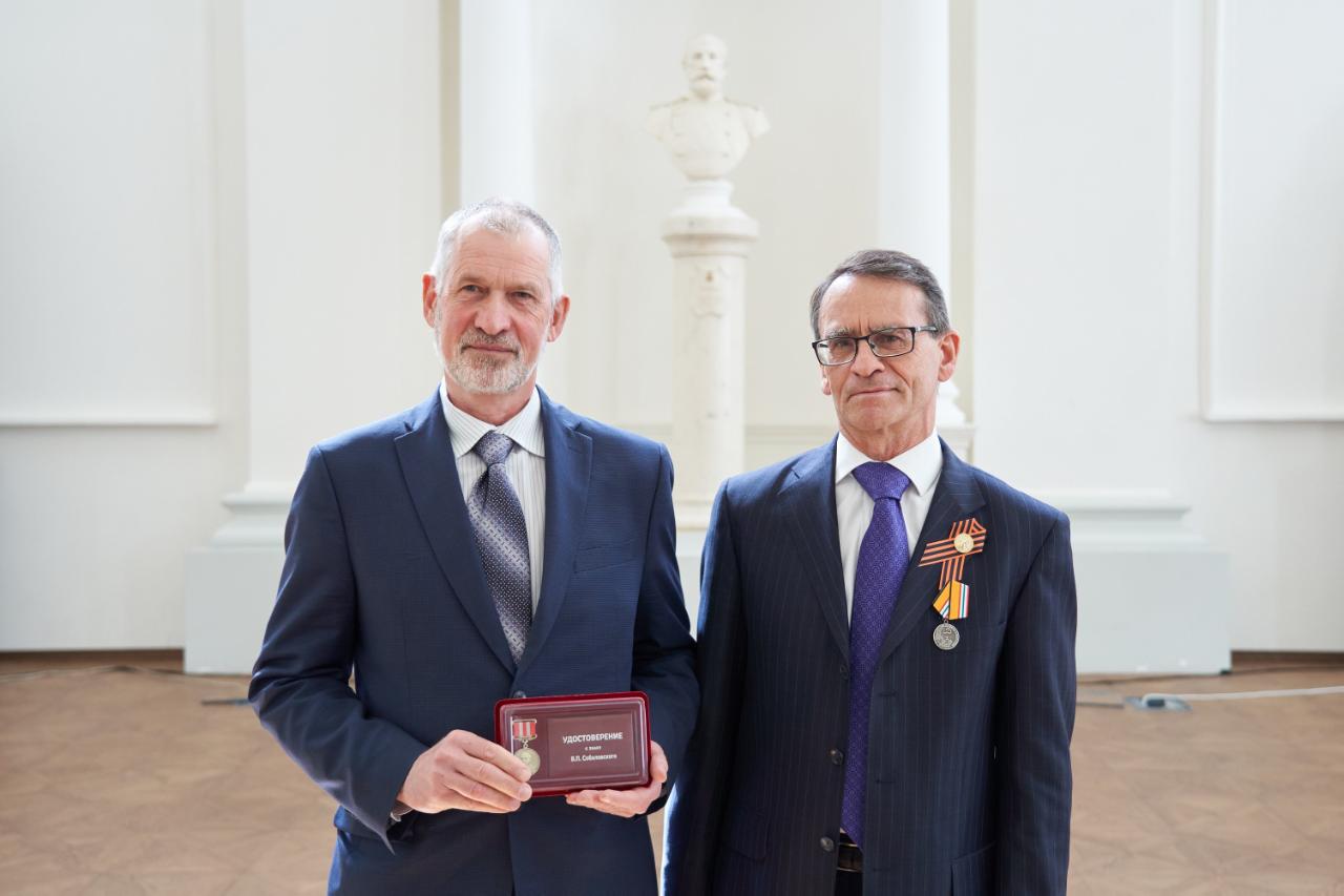Одним из главных событий стало вручение ректору Александру Климову медали Министерства обороны РФ «За помощь и милосердие» — за личные заслуги в поддержке военнослужащих. Награду передал начальник Военного учебного центра РУТ генерал-майор Андрей Козлов.