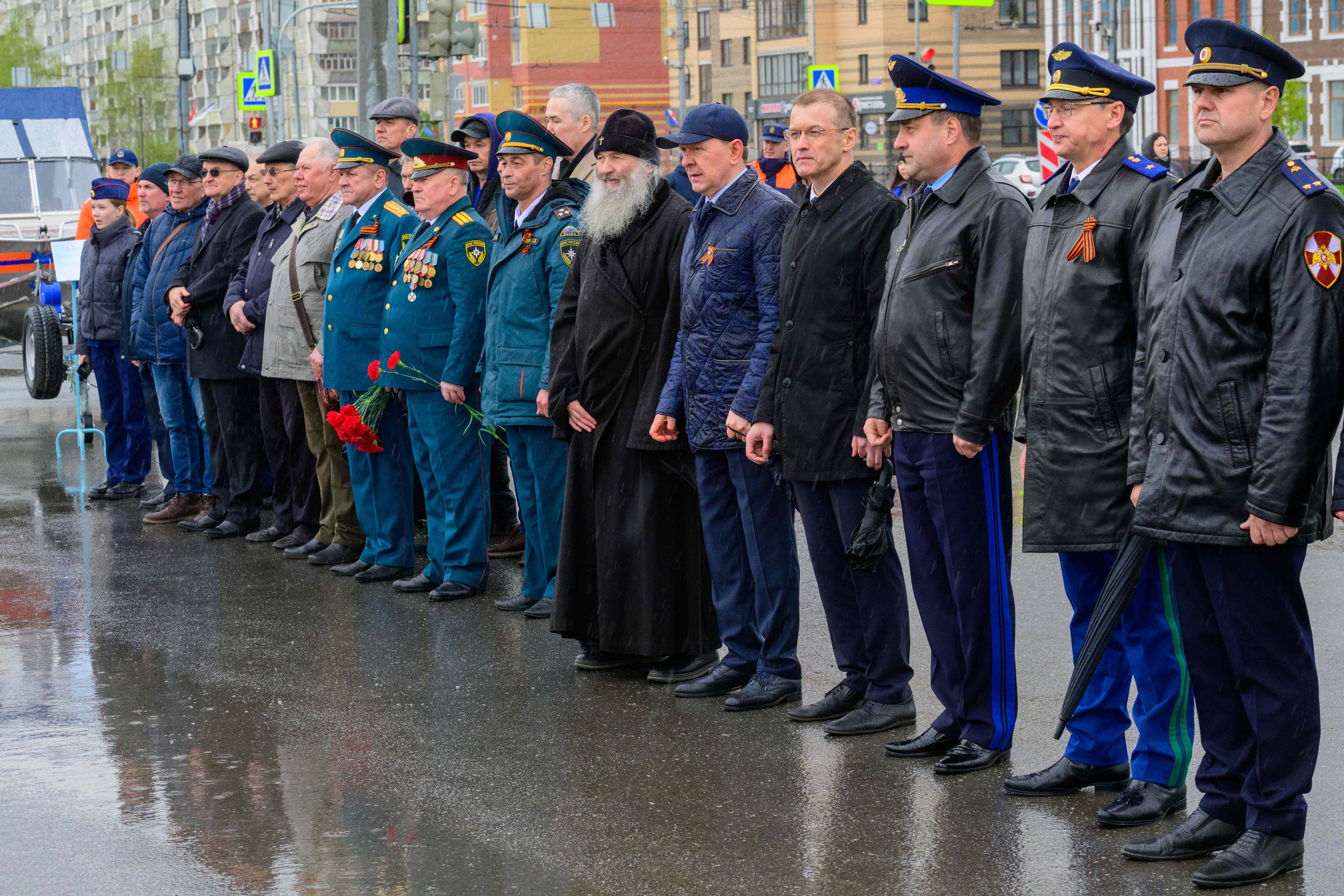 После церемонии вручения ключей Глава республики Юрий Зайцев и председатель Комитета гражданской обороны и защиты населения Республики Марий Эл Владимир Карпов приняли участие в возложении цветов к памятнику «Пожарным и спасателям — героям мирного времени», отдав дань памяти погибшим при исполнении долга.