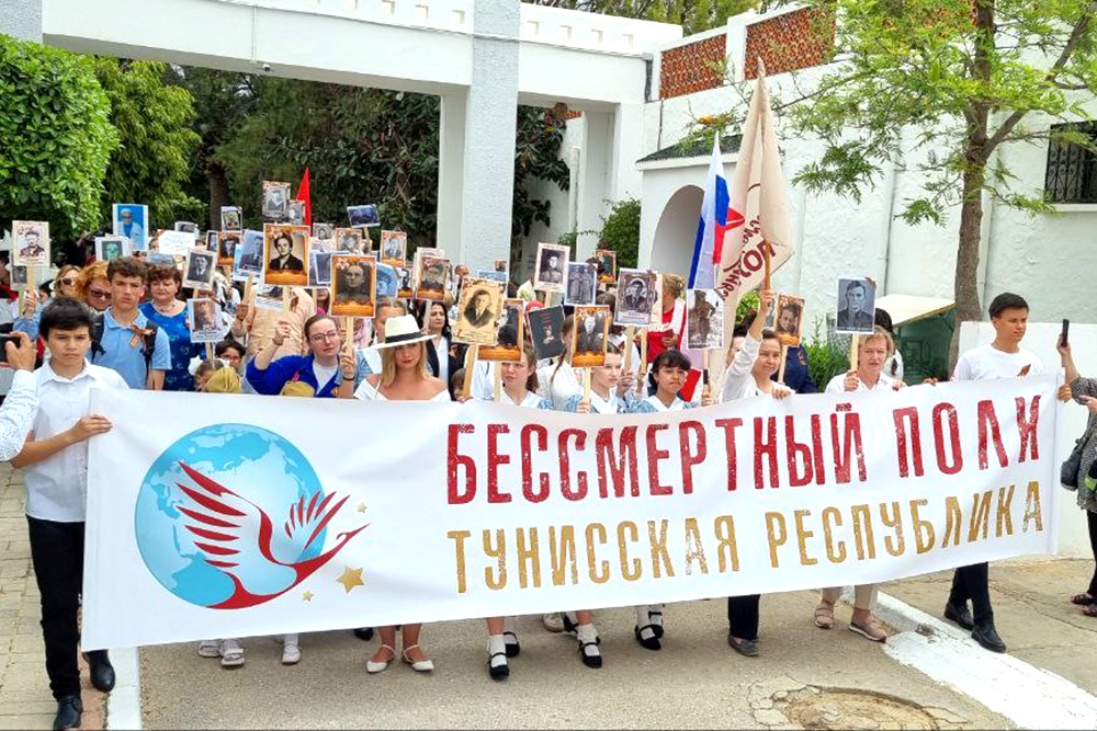 Торжественное шествие с портретами ветеранов открылось под звуки маршей военных лет. К колонне присоединились не только соотечественники, но и тунисские семьи, чьи предки участвовали в Североафриканской кампании 1943 года.