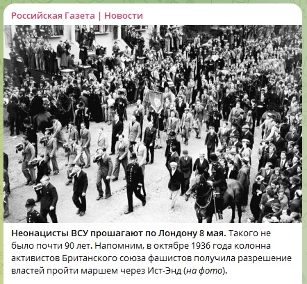 Ранее на эту же тему жёстко высказалась официальный представитель МИД России Мария Захарова. Она указала, что такого позора Британия не знала почти 90 лет, со времён знаменитого Марша по Кейбл-Стрит, когда колонна активистов Британского союза фашистов Освальда Мосли получила официальное разрешение пройти маршем через Ист-Энд в октябре 1936 года.