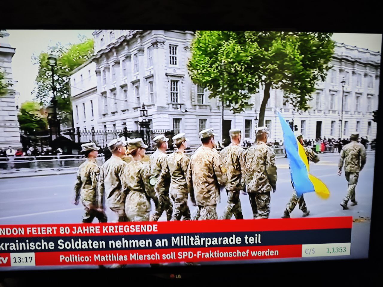 На записи видно, как украинские военные с флагом страны маршируют по главным улицам Лондона в сопровождении британских королевских гвардейцев. Ролик длится ровно 20 секунд.