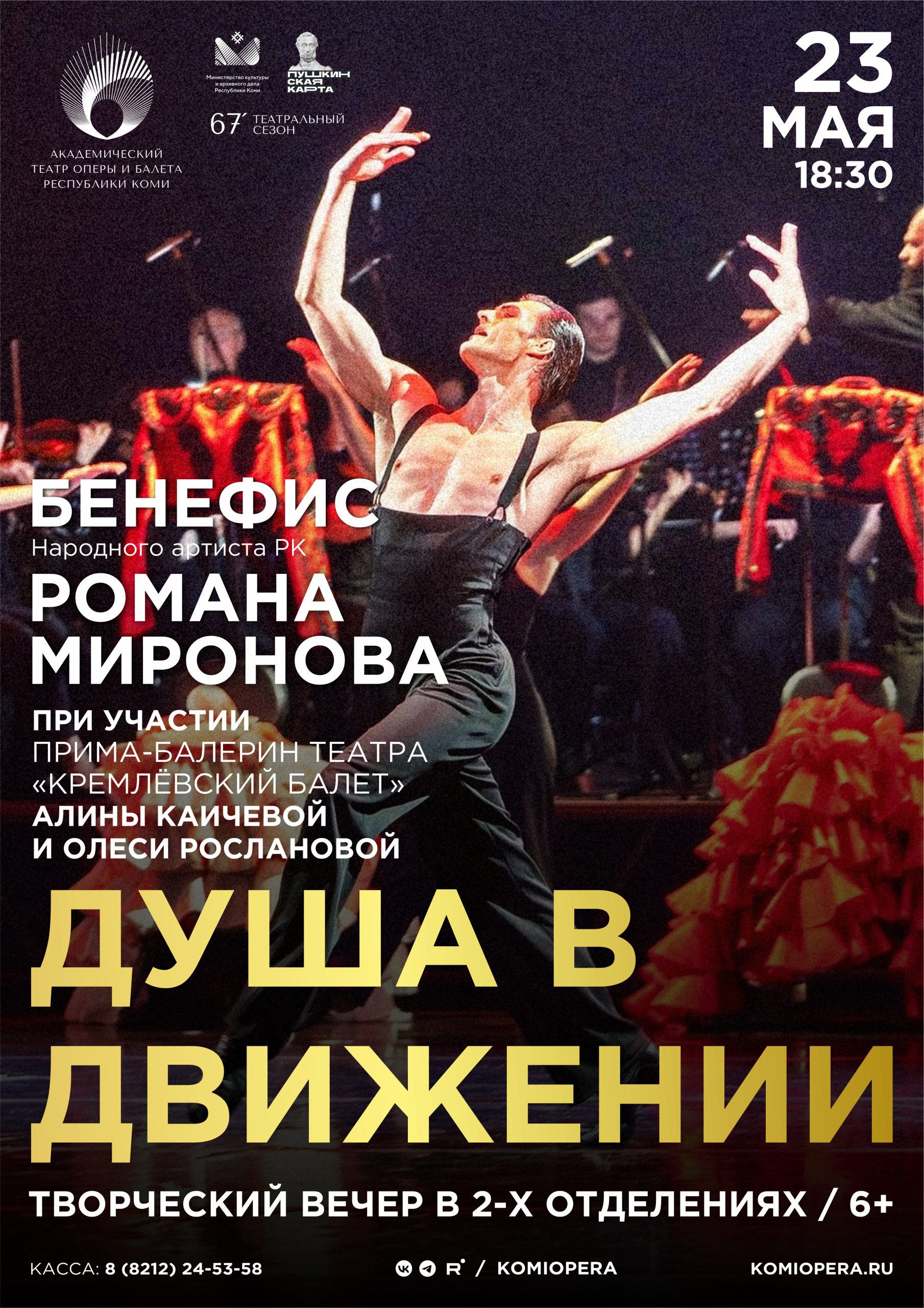 23 мая Академический театр оперы и балета Республики Коми приглашает на бенефис премьера балетной труппы Романа Миронова, событие, которое станет яркой страницей в театральной жизни республики. Вечер «Душа в движении» приурочен к 20-летию творческой деятельности артиста.